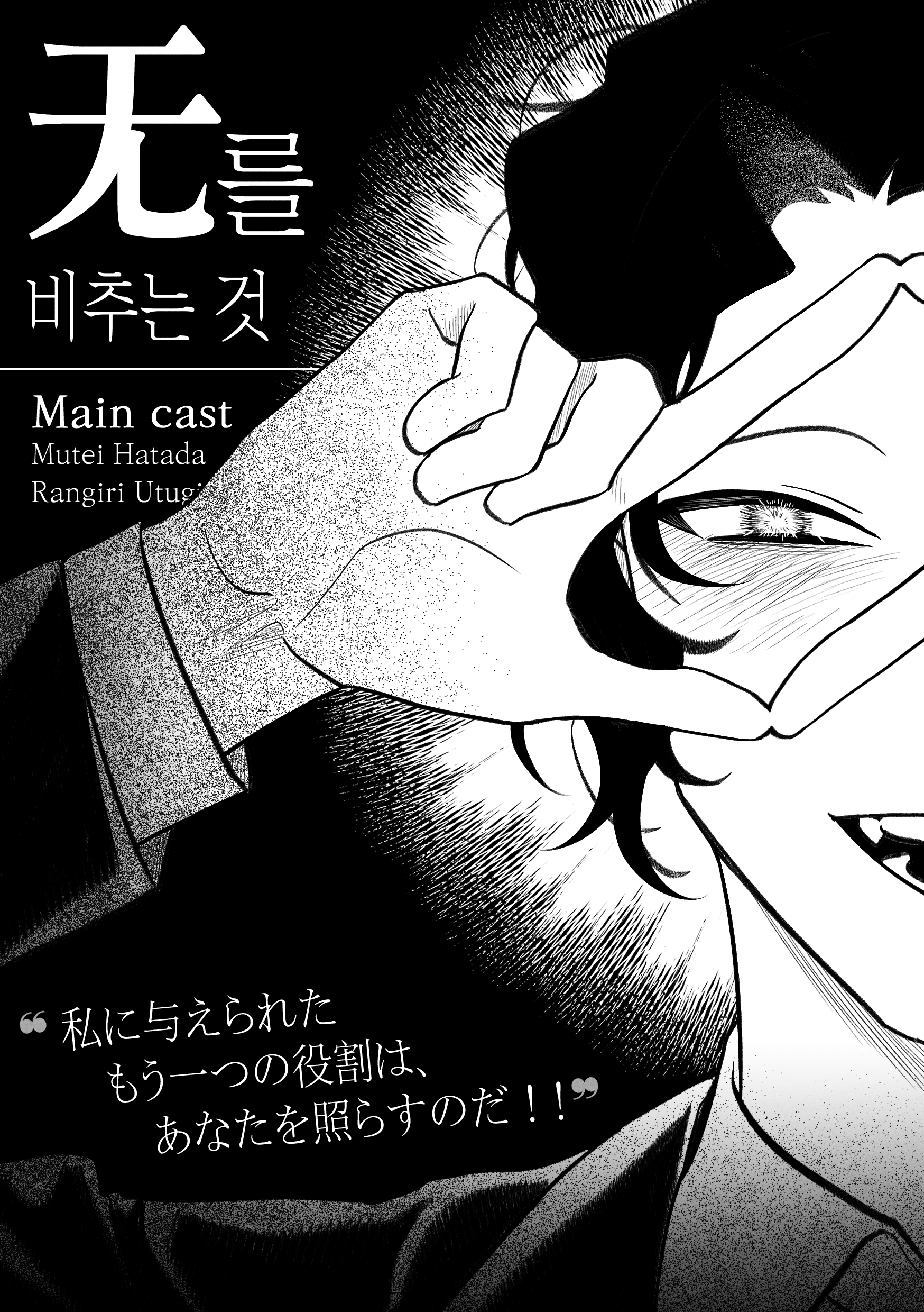 1boy absurdres blush character_name collared_shirt commentary_request english_text fang finger_frame finger_frame_over_eye greyscale highres jacket jjeom korean_commentary korean_text long_sleeves male_focus mixed-language_text monochrome open_mouth portrait saibou_shinkyoku shirt short_hair smile solo translation_request utsugi_rangiri