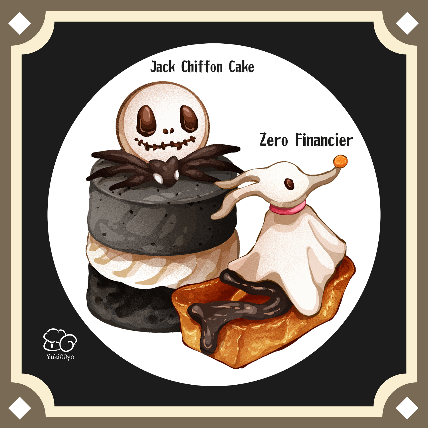 artist_logo artist_name cake character-themed_food chiffon_cake financier_(food) food food_focus food_name highres jack_skellington logo no_humans original syrup the_nightmare_before_christmas yuki00yo zero_(nbc)
