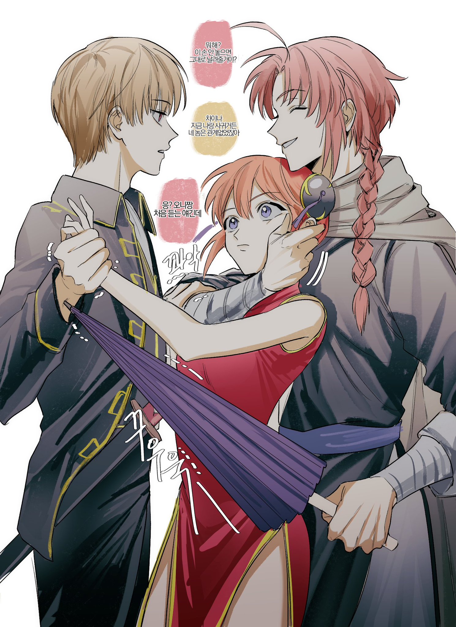 1girl 2boys black_jacket black_pants black_robe blue_eyes braid brother_and_sister brown_hair bun_cover cloak double_bun dress gintama hair_bun highres holding holding_umbrella jacket kagura_(gintama) kamui_(gintama) katana korean_text long_hair m_m_pb multiple_boys oil-paper_umbrella okita_sougo orange_hair pants red_dress red_eyes robe siblings single_braid sword translation_request umbrella weapon white_cloak