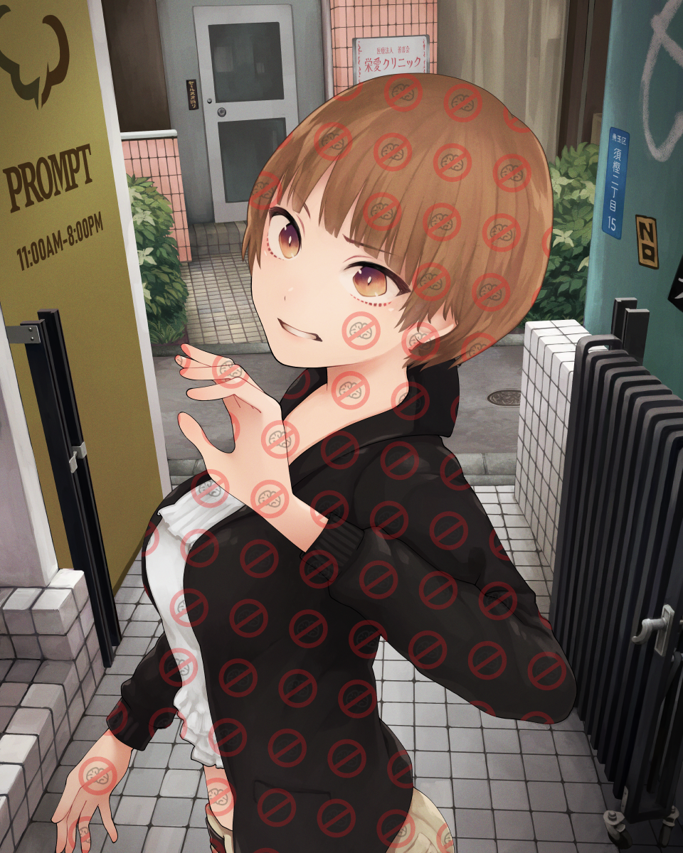 1girl ai-generated_art_(topic) black_cardigan brain breasts bright_pupils brown_eyes brown_hair brown_pants bush cardigan commentary cropped_shirt door english_text foliage frilled_shirt frills from_above from_side furrowed_brow gate grimace hand_up highres long_sleeves looking_at_viewer looking_to_the_side looking_up manhole_cover medium_breasts midriff no_symbol open_cardigan open_clothes original outdoors pants parted_lips road shirt short_hair sign solo tile_floor tile_wall tiles translated very_short_hair watermark white_pupils white_shirt yajirushi_(chanoma)