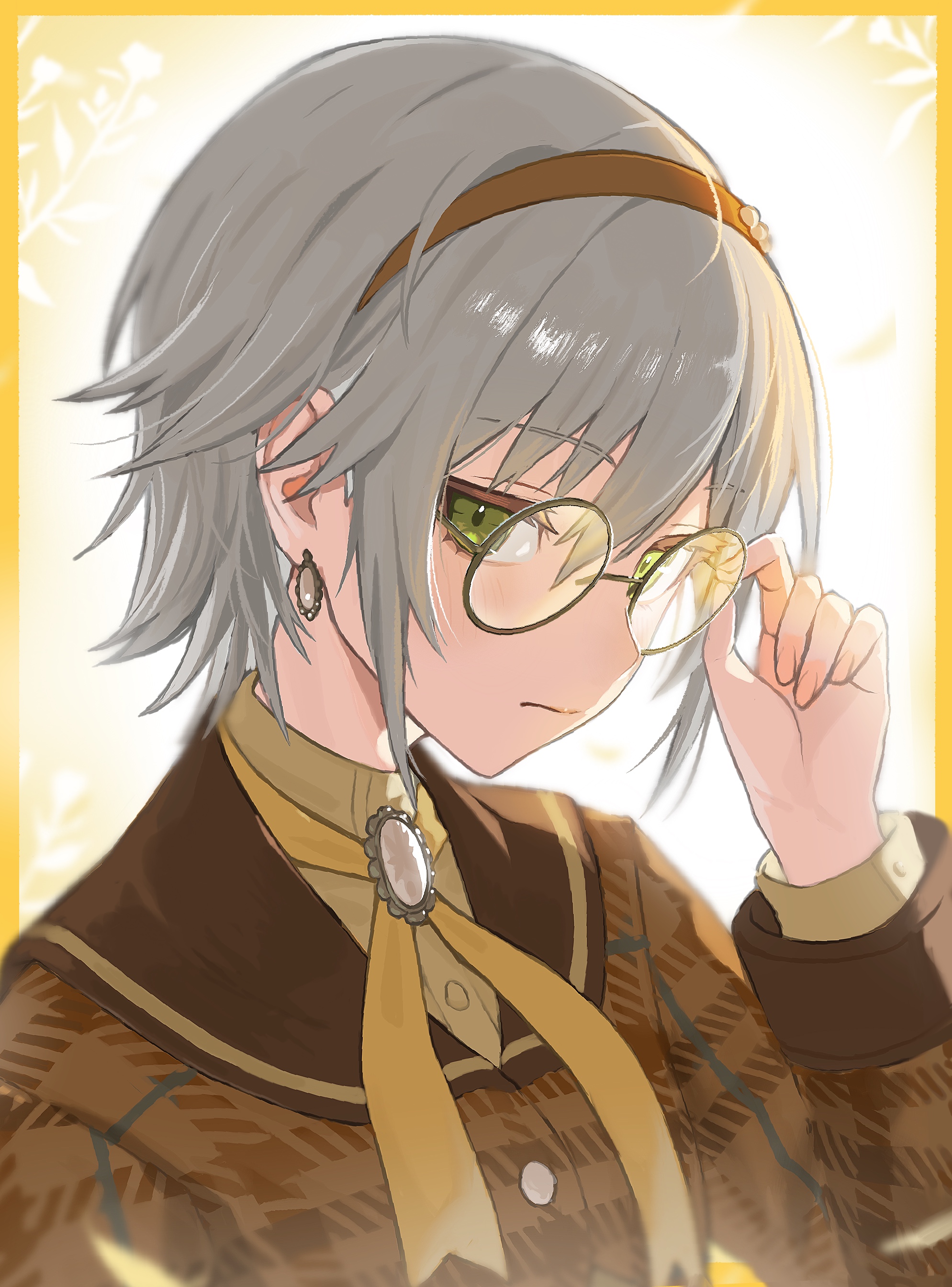 absurdres adjusting_eyewear blazer brown_jacket earrings gem glasses green_eyes grey_hair hand_on_eyewear happy_enjoy_music!_(project_sekai) headband highres hinomori_shiho jacket jewelry looking_to_the_side neckerchief official_alternate_costume patterned_clothing pendant plaid_clothes plaid_jacket project_sekai round_eyewear short_hair wawasuke white_gem