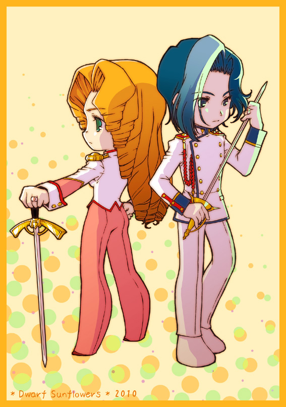 10s 1990s_(style) 1boy 1girl 2010 aiguillette arisugawa_juri bad_id bad_pixiv_id blue_hair buttons curly_hair double-breasted green_eyes long_hair orange_hair retro_artstyle risatam school_uniform shoujo_kakumei_utena sword tsuchiya_ruka weapon yellow_background
