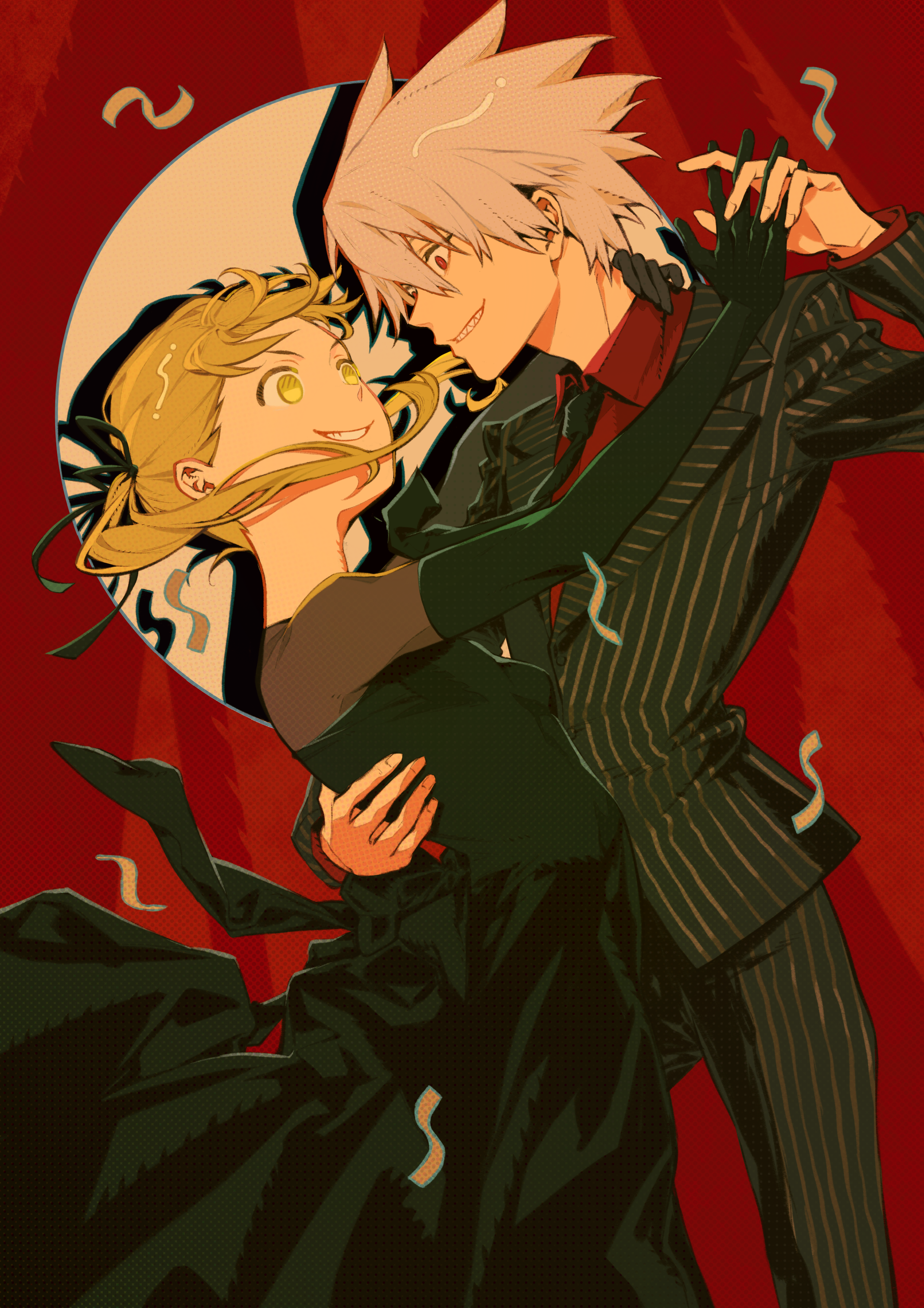 1boy 1girl absurdres black_dress black_gloves black_necktie blonde_hair breasts chinese_commentary collared_shirt commentary_request dancing dress elbow_gloves formal_clothes gloves grin hair_ribbon highres long_hair long_sleeves maka_albarn necktie pants pinstripe_jacket pinstripe_pants pinstripe_pattern pinstripe_suit red_background red_eyes red_shirt ribbon shirt short_hair small_breasts smile soul_eater soul_evans spotlight striped_suit suit tuzaixia twintails white_hair yellow_eyes