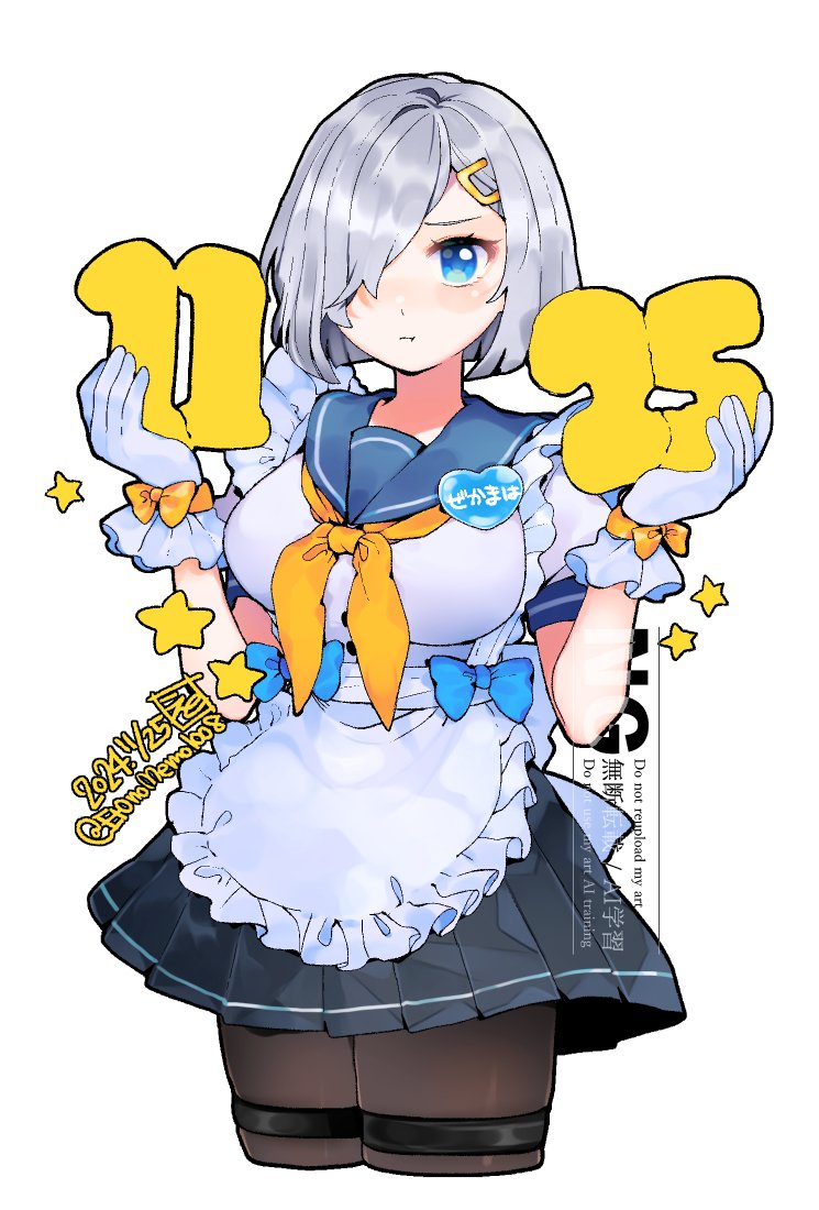1girl apron black_pantyhose blue_eyes blue_sailor_collar blush breasts dated eto_(etonomemo1008) frilled_gloves frills gloves grey_hair grey_sailor_collar grey_skirt hair_ornament hair_over_one_eye hairclip hamakaze_(kancolle) kantai_collection large_breasts looking_at_viewer neckerchief pantyhose sailor_collar school_uniform serafuku shirt short_hair skirt waist_apron watermark white_gloves white_shirt yellow_neckerchief