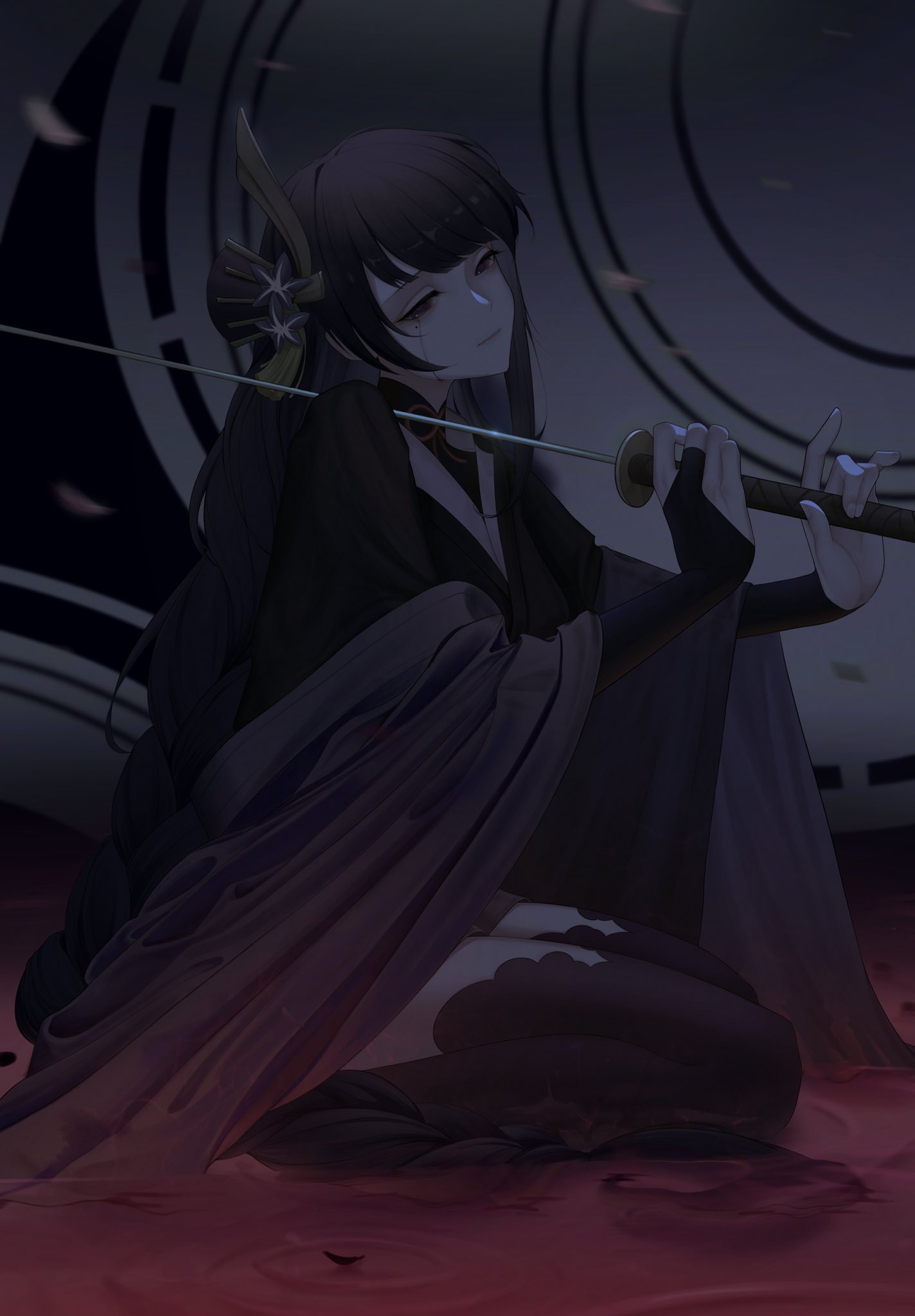 1girl ambiguous_red_liquid black_thighhighs blunt_bangs braid bridal_gauntlets cherry_blossoms closed_mouth commentary crying dark_room falling_petals from_side genshin_impact hair_ornament hands_up hashtag-only_commentary head_tilt highres holding holding_sword holding_weapon japanese_clothes kanzenkevi katana kimono long_braid long_hair looking_to_the_side mole mole_under_eye motion_blur neck_ribbon off_shoulder petals pink_lips purple_eyes purple_hair raiden_shogun red_ribbon ribbon ripples sad seiza single_braid sitting solo sword untranslatable_commentary tears thighhighs thighs weapon
