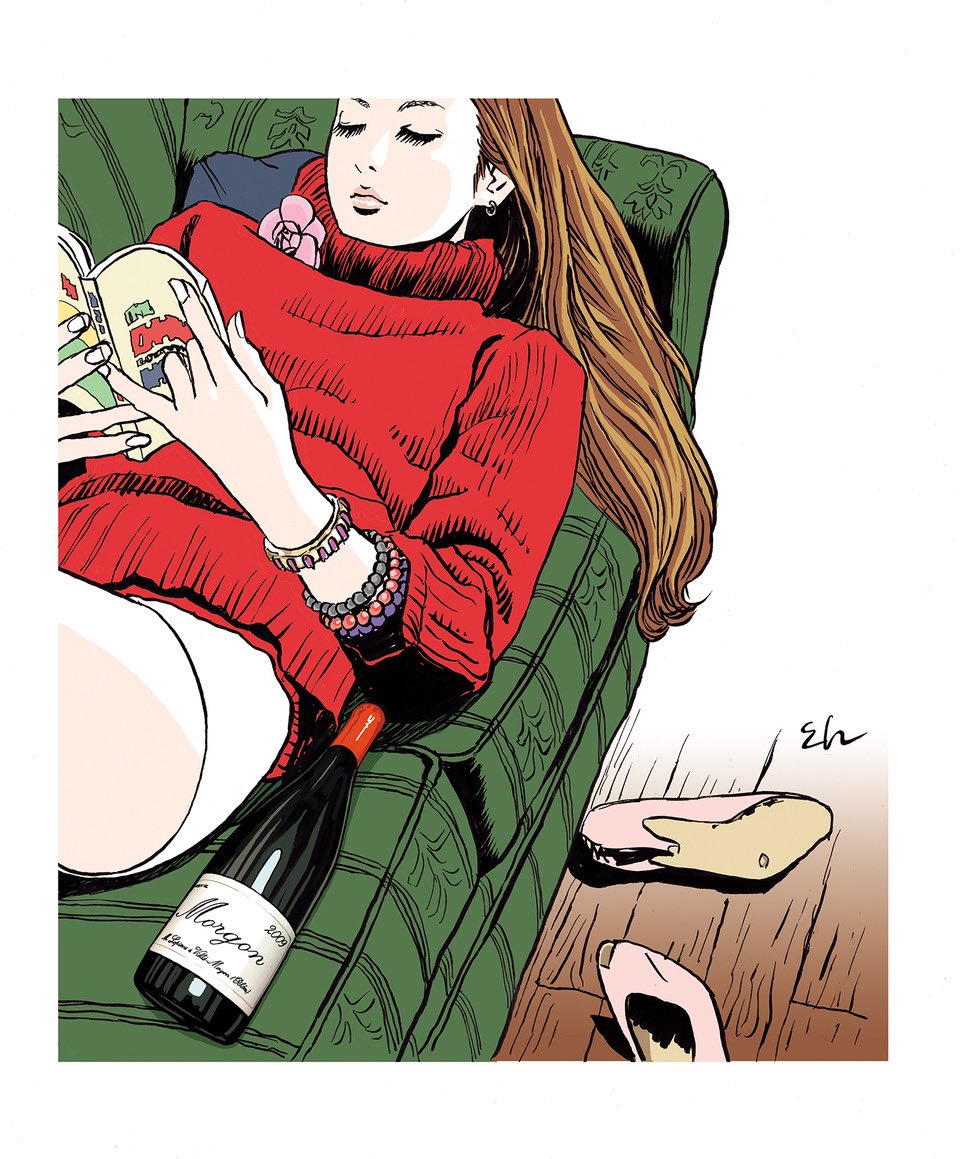 1girl book border bottle bracelet brown_hair chair closed_eyes closed_mouth couch earrings eguchi_hisashi fingernails floor flower high_heels holding holding_book indoors jewelry long_fingernails long_hair long_sleeves lying on_couch open_book original out_of_frame pink_flower pink_lips pink_shoes reading red_sweater shoes shorts signature solo sweater thick_lips turtleneck unworn_shoes white_border white_shorts wine_bottle wooden_floor