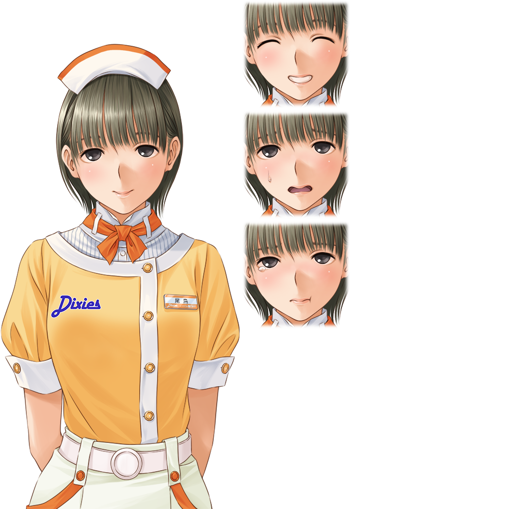 1girl :t arms_behind_back belt black_eyes black_hair blush bow bowtie buttoned_cuffs buttons closed_eyes multiple_expressions flustered grin headscarf lips looking_at_viewer love_plus multiple_views official_art open_mouth orange_bow orange_bowtie otori_nodoka pink_lips pout ribbon shirt short_hair short_sleeves smile sulking sweatdrop tareme tears teeth transparent_background turtleneck upper_body variations waitress white_belt yellow_shirt