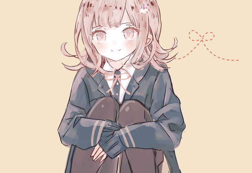 1girl black_thighhighs blue_jacket brown_background buttons closed_mouth collared_jacket collared_shirt commentary_request danganronpa_(series) danganronpa_2:_goodbye_despair dotted_line dress_shirt eyelashes feet_out_of_frame hair_ornament hairclip happy hugging_own_legs jacket knees_up lapels light_blush long_sleeves looking_at_viewer medium_hair nanami_chiaki neck_ribbon nocoyaki notched_lapels open_clothes open_jacket pink_eyes pink_hair pink_ribbon ribbon shirt simple_background sitting sleeves_past_wrists smile solo thighhighs white_shirt
