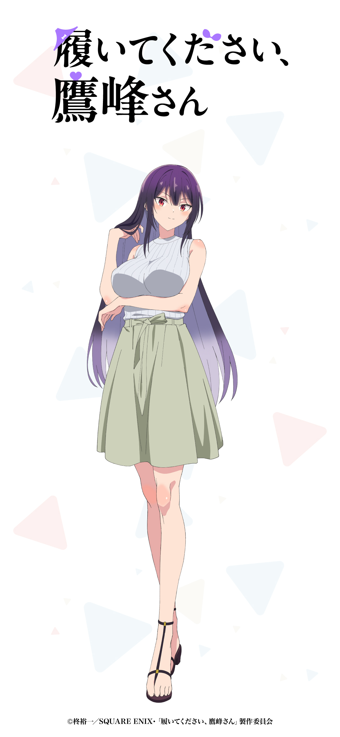 1girl absurdres adjusting_hair artist_request bare_legs bare_shoulders breasts full_body green_skirt haite_kudasai_takamine-san highres large_breasts long_hair looking_at_viewer official_art purple_hair red_eyes sandals simple_background skirt solo takamine_takane white_background