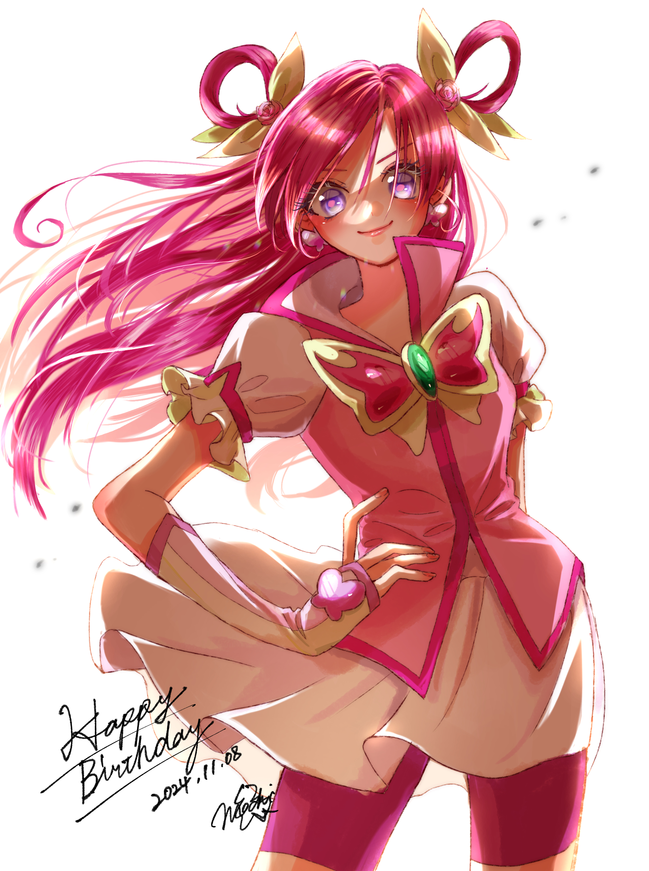 1girl absurdres bike_shorts bike_shorts_under_skirt blush brooch butterfly_brooch butterfly_earrings closed_mouth cure_dream dated dress earrings fingerless_gloves flower gloves hair_flower hair_ornament hair_ribbon hair_rings happy_birthday highres jewelry long_hair magical_girl matsuo_mochi pink_hair pink_shorts pink_vest precure puffy_short_sleeves puffy_sleeves purple_eyes ribbon short_sleeves shorts signature smile solo two-tone_gloves vest white_dress yellow_ribbon yes!_precure_5 yes!_precure_5_gogo! yumehara_nozomi