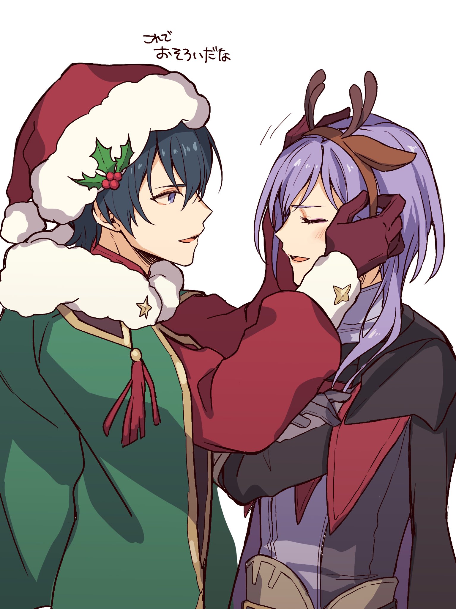 2boys 31767d animal_ears antlers black_cape blue_eyes blue_hair blush male_byleth_(fire_emblem) male_byleth_(frosty_professor)_(fire_emblem) cape christmas commentary_request cowboy_shot crossed_arms deer_ears fake_animal_ears fire_emblem fire_emblem:_three_houses fur-trimmed_cape fur_trim gloves gold_trim green_cape grey_gloves hair_ornament hat highres holly holly_hair_ornament horns long_hair long_sleeves looking_at_another male_focus multiple_boys nintendo open_mouth parted_lips purple_hair red_gloves red_shirt reindeer_antlers santa_hat shirt simple_background tassel tongue white_background white_fur yuri_leclerc
