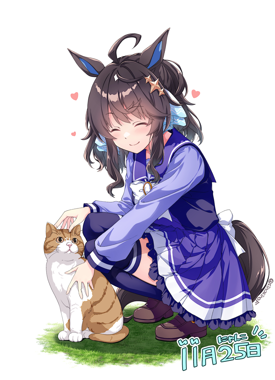 1girl ahoge animal_ears black_hair blush cat closed_eyes closed_mouth daring_tact_(umamusume) dated grass hair_ornament happy heart highres horse_ears horse_girl horse_tail school_uniform shinohara_shinome smile star_(symbol) star_hair_ornament tail tracen_school_uniform twitter_username umamusume