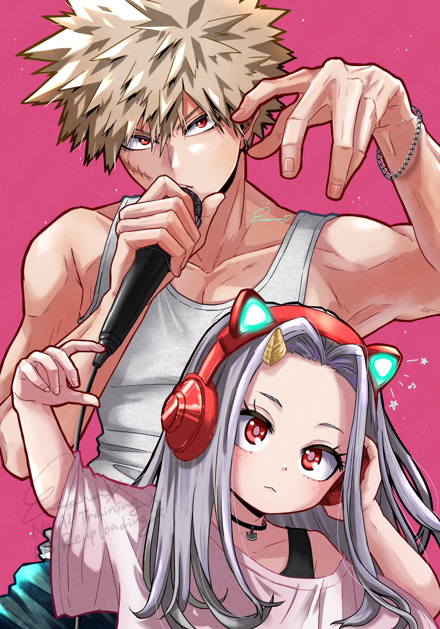 1boy 1girl animal_ear_headphones animal_ears bakugou_katsuki blonde_hair boku_no_hero_academia bracelet cat_ear_headphones cat_ears closed_mouth eri_(boku_no_hero_academia) esora-arts fake_animal_ears grey_hair headphones highres holding holding_microphone horns jewelry long_hair looking_at_viewer microphone pink_background red_eyes scar scar_on_face shirt short_hair single_horn spiked_hair tank_top toned toned_male white_shirt white_tank_top