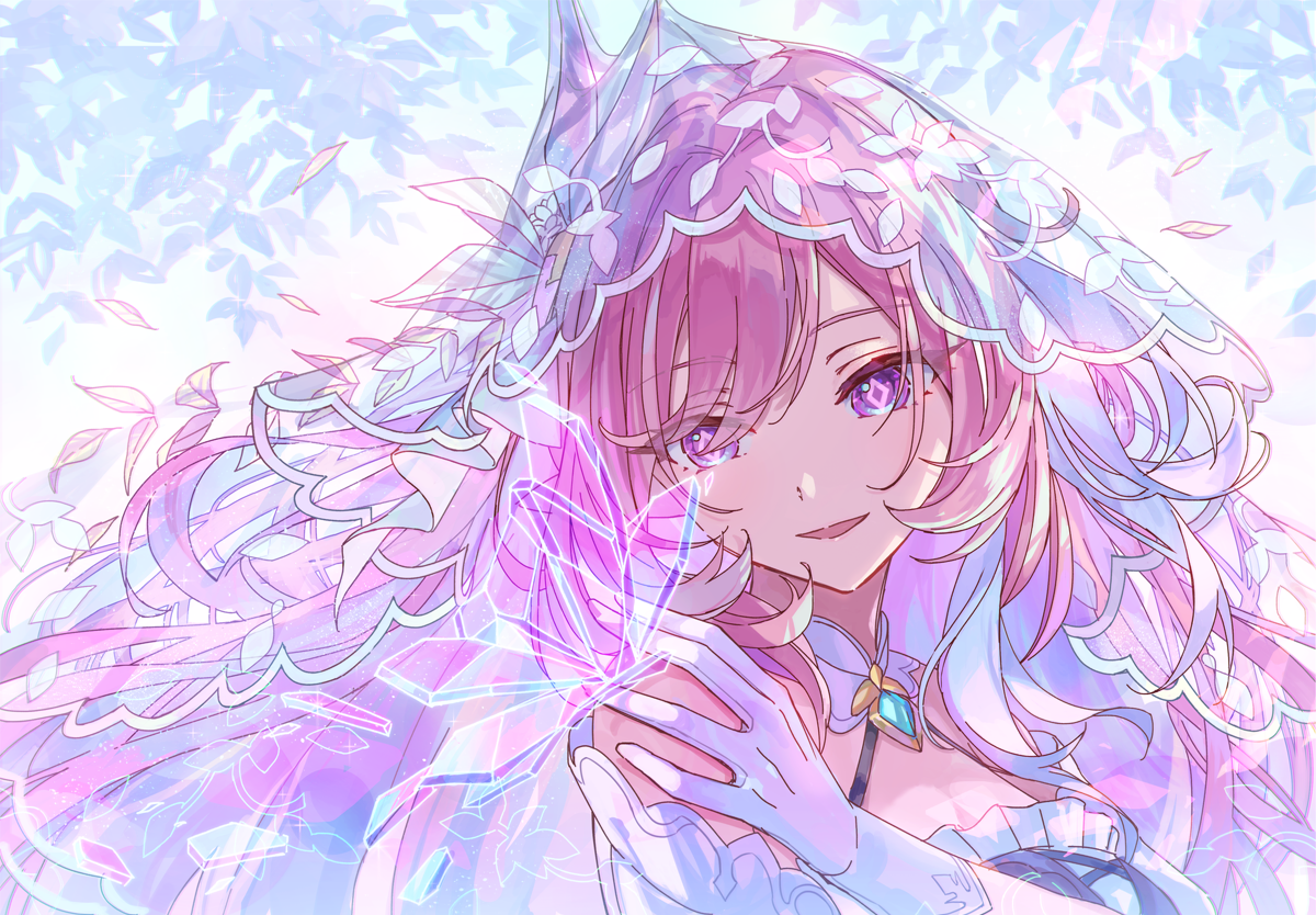 1girl alternate_costume bare_shoulders bridal_veil commentary diamond-shaped_pupils diamond_(shape) elysia_(herrscher_of_human:_ego)_(honkai_impact) elysia_(honkai_impact) gloves honkai_(series) honkai_impact_3rd long_hair looking_at_viewer papipiko parted_lips pink_hair purple_eyes solo symbol-shaped_pupils veil very_long_hair white_gloves