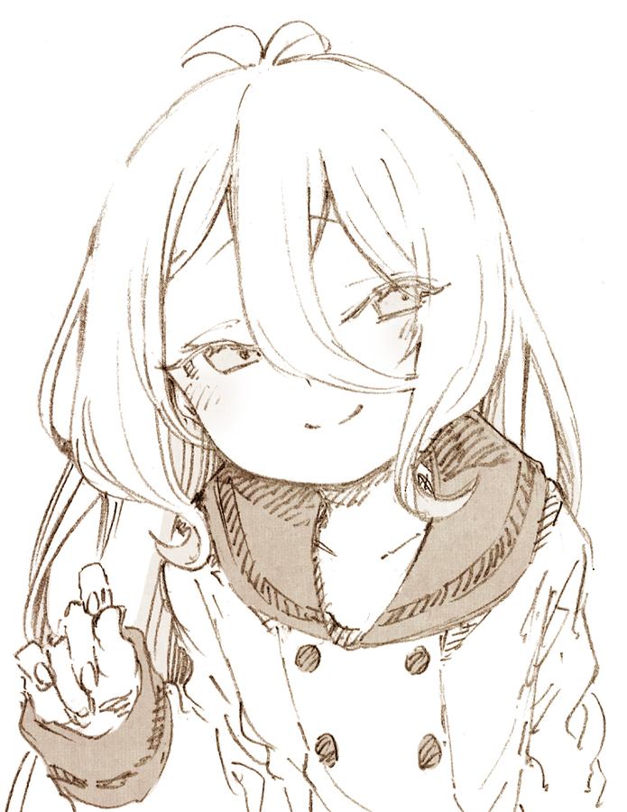 1girl abara_heiki antenna_hair closed_mouth dress duplicate greyscale hair_between_eyes kokkoro_(princess_connect!) kokkoro_(real)_(princess_connect!) long_hair long_sleeves looking_at_viewer monochrome pixel-perfect_duplicate princess_connect! sailor_collar sailor_dress simple_background sleeves_past_wrists smile solo split_mouth upper_body very_long_hair white_background