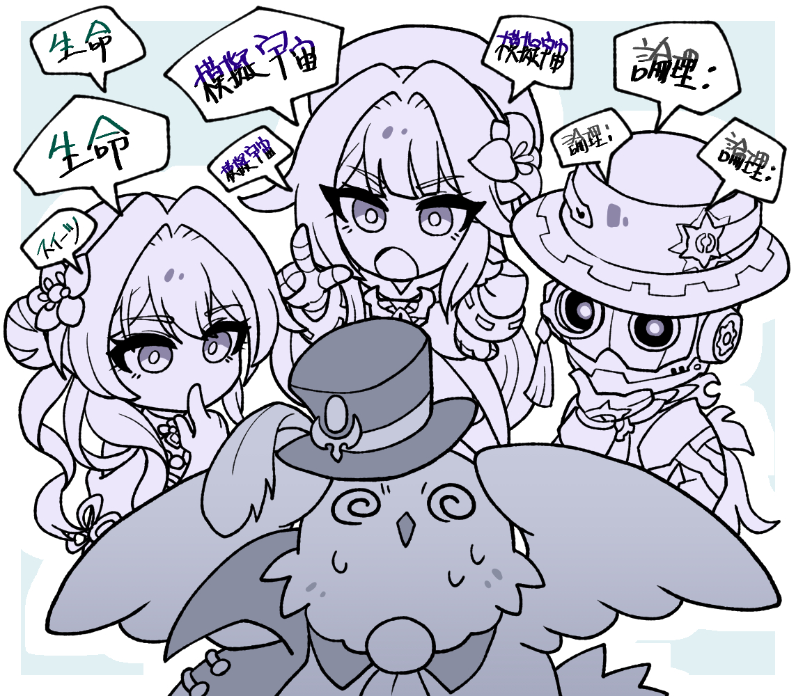 1boy 2girls android bead_necklace beads bird commentary_request doll_joints gloves greyscale hair_bun hair_intakes hand_up hat herta_(puppet)_(honkai:_star_rail) honkai:_star_rail honkai_(series) index_finger_raised jewelry joints krakrignmr long_hair long_sleeves monochrome multiple_girls necklace open_mouth owl owlbert_(honkai:_star_rail) purple_eyes ruan_mei_(honkai:_star_rail) screwllum_(honkai:_star_rail) sidelocks speech_bubble spot_color top_hat translation_request very_long_hair