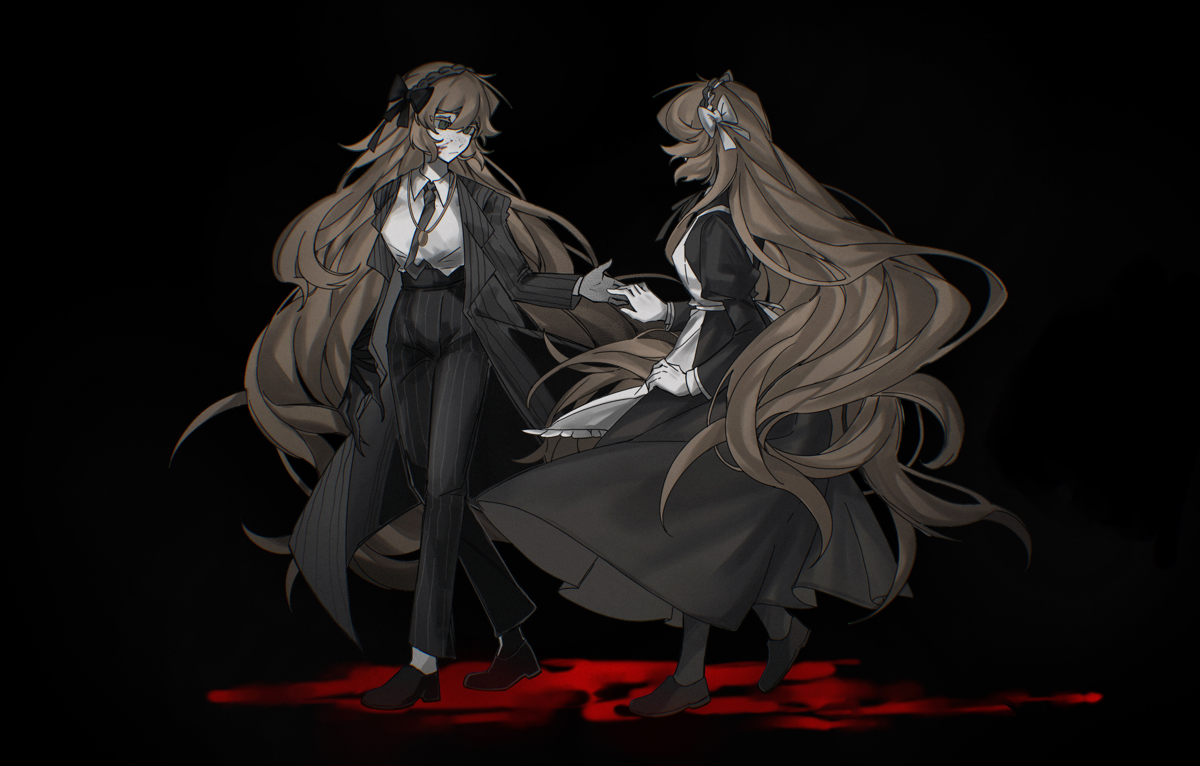 2girls absurdres apron asymmetrical_arms black_dress blood bow bygone_days_(e.g.o) coat collared_shirt dress dual_persona e.g.o_(project_moon) freckles hair_bow highres holding_hands ishmael_(project_moon) jewelry juliet_sleeves limbus_company loafers long_dress long_hair long_sleeves maid multiple_girls necktie_tucked_into_waistband open_clothes open_coat orange_hair pants pendant pinstripe_coat pinstripe_pants pinstripe_pattern project_moon puffy_sleeves shirt shoes tianmazhilei very_long_hair white_apron white_shirt wuthering_heights_(identity)_(project_moon)