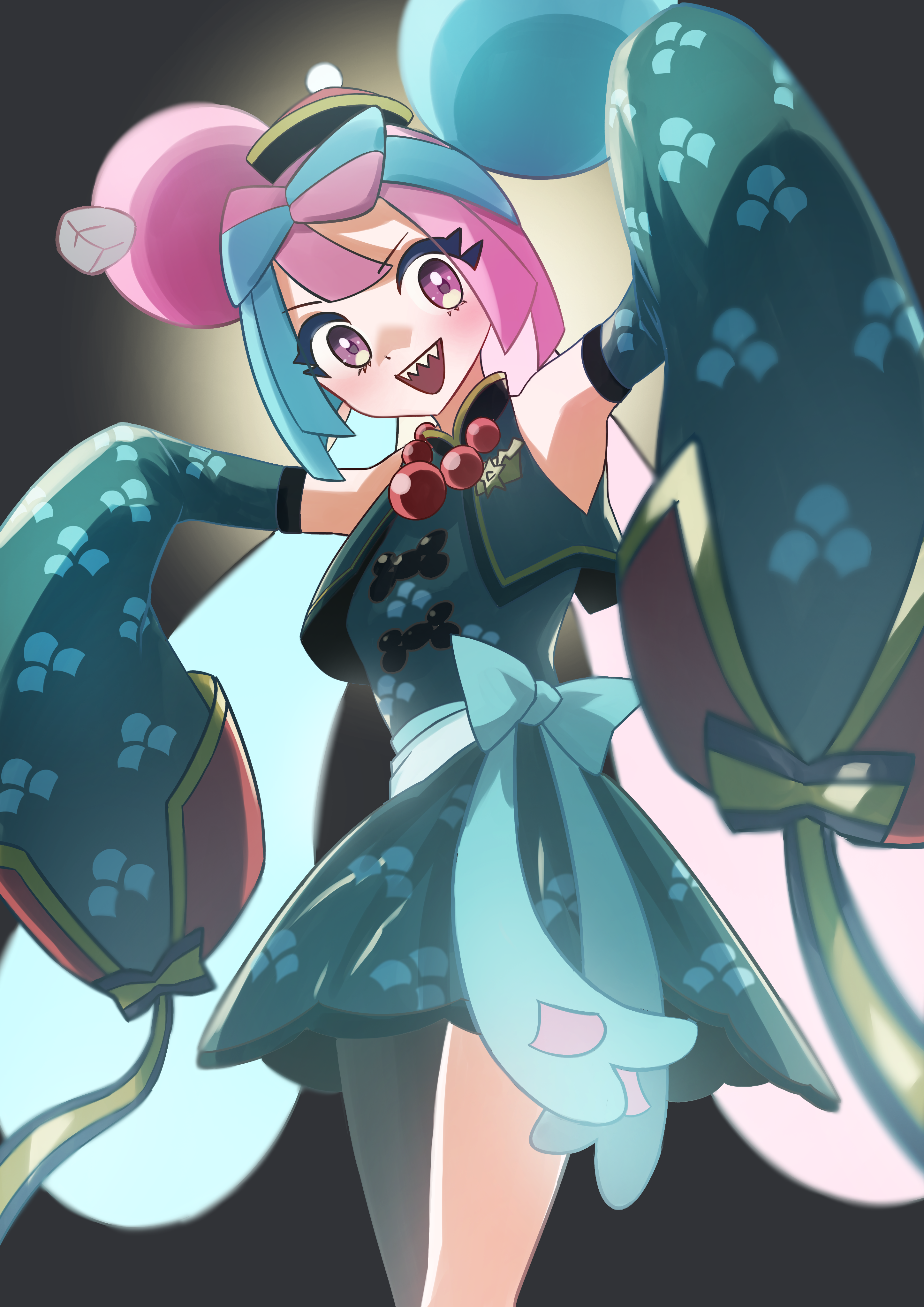 1girl absurdres highres iono_(fall_2024)_(pokemon) iono_(pokemon) jiangshi_costume long_hair mikan_(mikan_no_happa) nintendo official_alternate_costume open_mouth pokemon pokemon_masters_ex sharp_teeth solo teeth very_long_hair