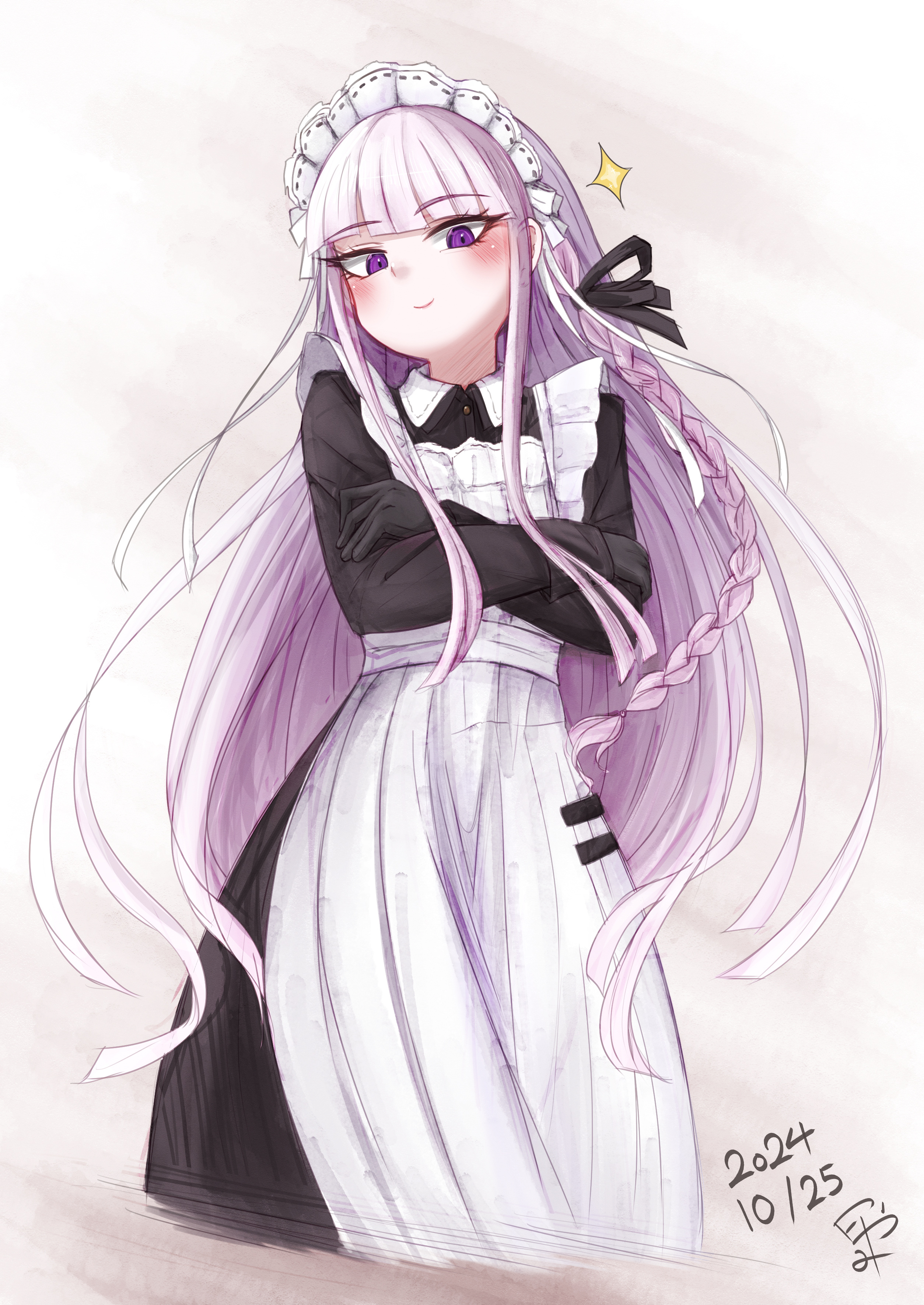 1girl absurdres alternate_costume apron black_dress black_gloves black_ribbon blunt_bangs blush braid closed_mouth cropped_legs danganronpa:_trigger_happy_havoc danganronpa_(series) dated dress enmaided gloves grey_background grey_hair hair_ribbon highres kirigiri_kyoko long_hair long_sleeves maid maid_apron maid_headdress ribbon rutomiartdayo side_braid simple_background smile smug solo sparkle white_apron