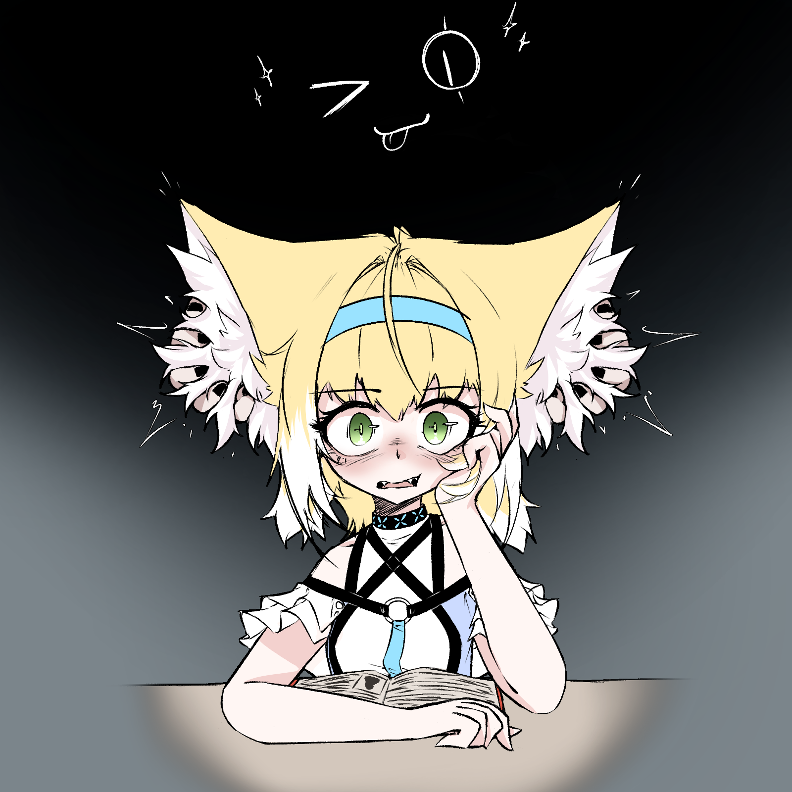 2girls animal_ear_fluff animal_ears arknights blonde_hair blue_hairband commentary english_commentary fox_ears fox_girl green_eyes hairband highres infection_monitor_(arknights) lappland_(arknights) multiple_girls open_mouth solo_focus suzuran_(arknights) tofusquisha