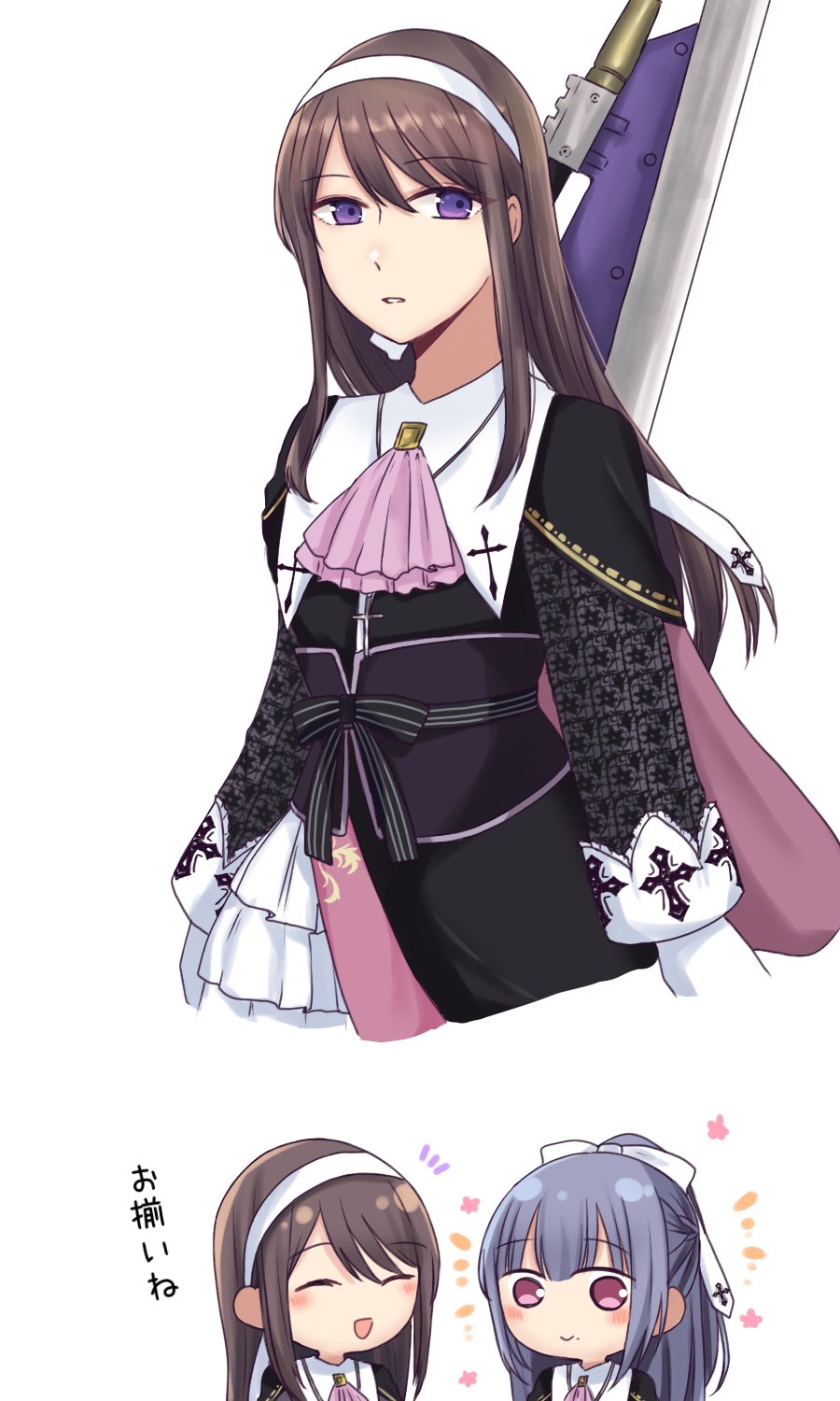 2girls :d ^_^ adapted_costume arms_at_sides ascot assault_lily asymmetrical_clothes black_capelet black_dress blush bow brown_hair cape capelet chibi closed_eyes commentary cowboy_shot cropped_legs cross cross_necklace cross_print dress flower_symbol frilled_dress frilled_sleeves frills fukuyama_jeanne_sachie gloves grey_hair hair_bow hair_ribbon hairband half_updo highres jewelry kishimoto_maria_mirai latin_cross layered_dress long_hair long_sleeves looking_ahead looking_at_viewer matching_outfits mole mole_under_mouth multiple_girls multiple_views necklace nigari_(ngari_0115) no_pupils notice_lines official_alternate_costume open_mouth parted_lips pink_ascot pink_cape pink_eyes print_dress print_ribbon purple_eyes ribbon sidelocks smile standing translated two-tone_dress underbust upper_body weapon weapon_on_back white_bow white_dress white_gloves white_hairband white_ribbon