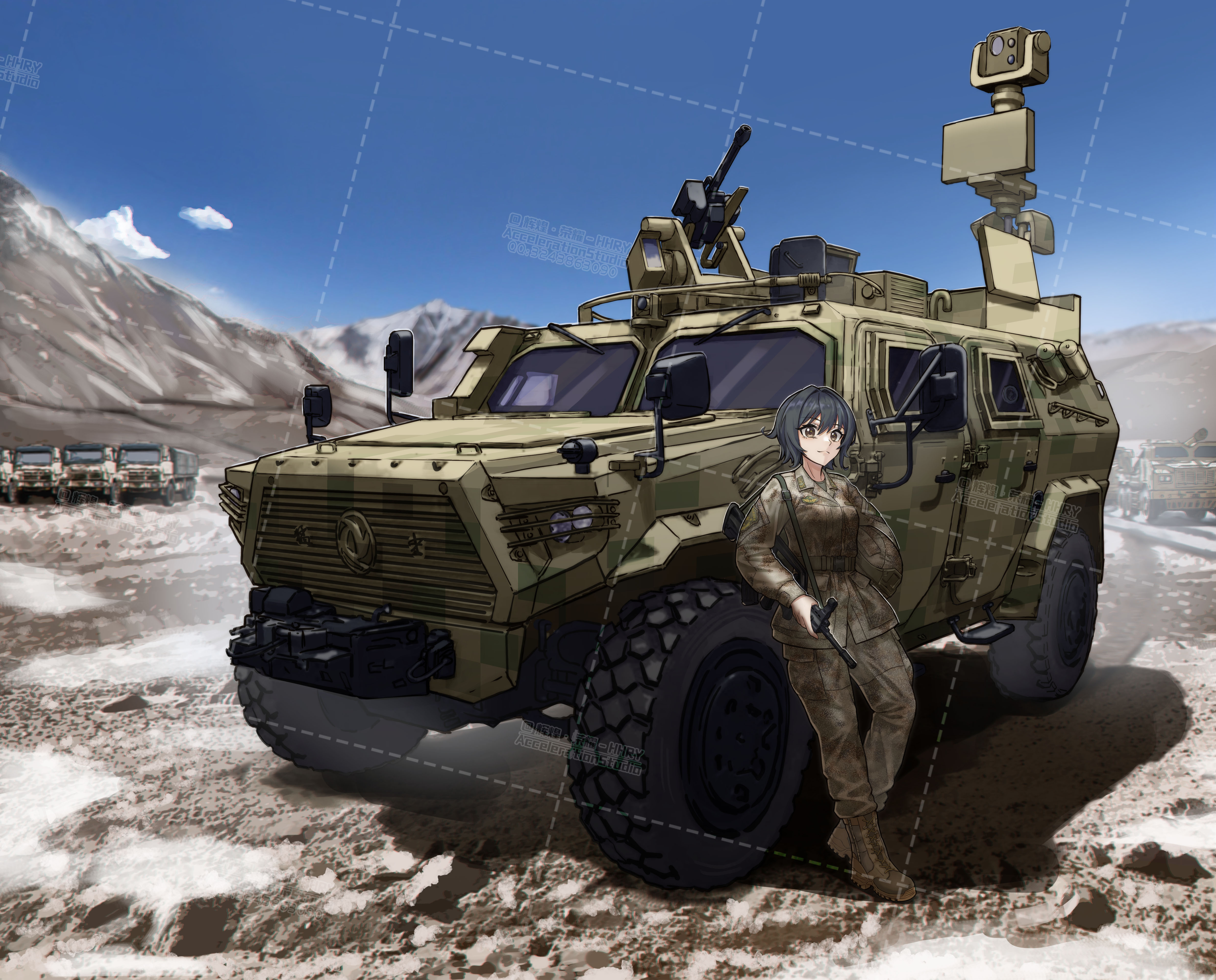 1girl absurdres armored_personnel_carrier armored_vehicle artist_name assault_rifle black_hair blue_sky boots breasts brown_eyes bullpup camouflage china chinese_commentary closed_mouth cloud combat_boots combat_helmet commentary day english_commentary gun gun_sling helmet highres holding holding_unworn_helmet huihuang_rongyao leaning leaning_back looking_at_viewer machine_gun medium_breasts military military_combat_uniform military_rank_insignia military_uniform military_vehicle motor_vehicle mountainous_horizon original people's_liberation_army qbz-95 rifle short_hair sky solo truck unworn_helmet vehicle_focus vehicle_request watermark watermark_grid weapon weapon_request