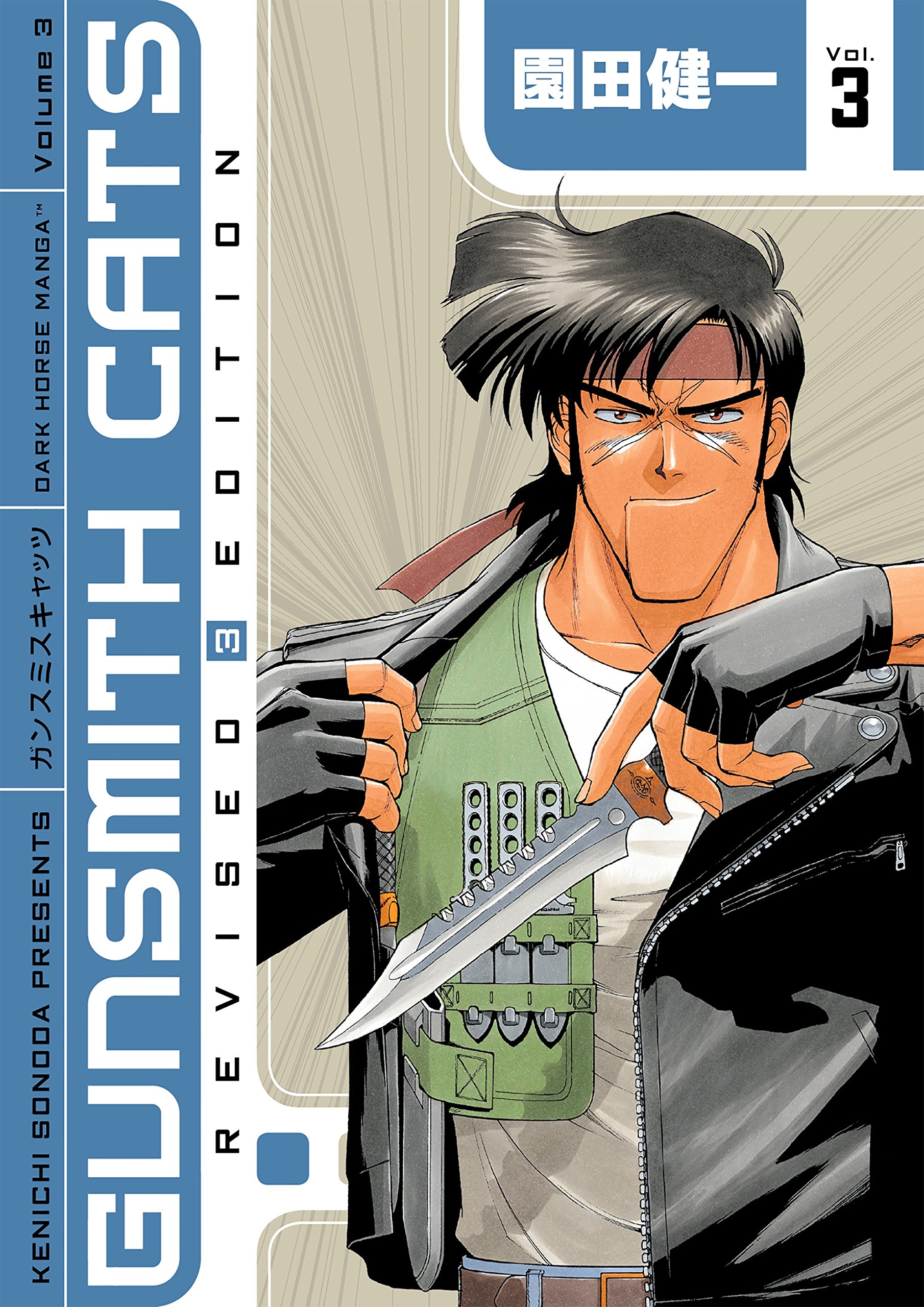 1boy absurdres artist_name belt belt_buckle black_gloves black_hair black_jacket blue_pants blue_theme brown_background brown_belt brown_eyes buckle cheekbones closed_mouth collared_jacket combat_knife copyright_name cover cover_page cross_scar denim english_text fingerless_gloves gloves green_vest gunsmith_cats highres holding holding_knife holding_weapon jacket jeans knife leather leather_jacket light_smile long_sleeves looking_at_viewer male_focus manga_cover mixed-language_text muscular muscular_male narrowed_eyes numbered official_art open_clothes open_vest opened_by_self pants romaji_text scar scar_on_face shirt smirk solo sonoda_ken'ichi straight-on sunburst sunburst_background swept_bangs t-shirt throwing_knife title translated unzipped v-shaped_eyebrows vest weapon white_shirt zipper