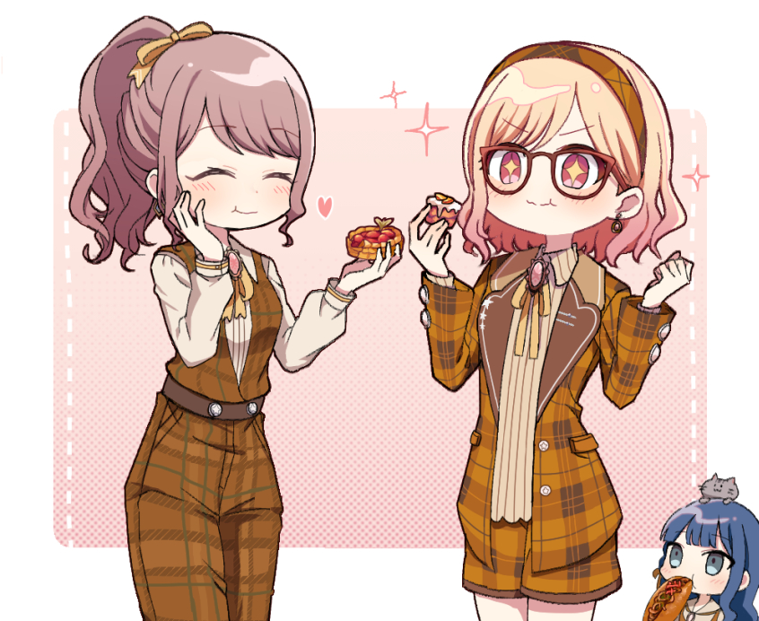 belt blazer blonde_hair blush bow byaabo closed_eyes commentary dessert earrings eating food glasses gradient_hair hair_bow hand_on_own_cheek hand_on_own_face happy_enjoy_music!_(project_sekai) headband high_ponytail hoshino_ichika_(project_sekai) jacket jewelry jumpsuit lapels light_brown_hair long_hair long_sleeves mochizuki_honami multicolored_hair neck_ribbon official_alternate_costume official_alternate_hairstyle open_clothes open_jacket parted_bangs pendant plaid_clothes plaid_jacket plaid_shorts ponytail project_sekai ribbon shorts sparkling_eyes tenma_saki v-shaped_eyebrows