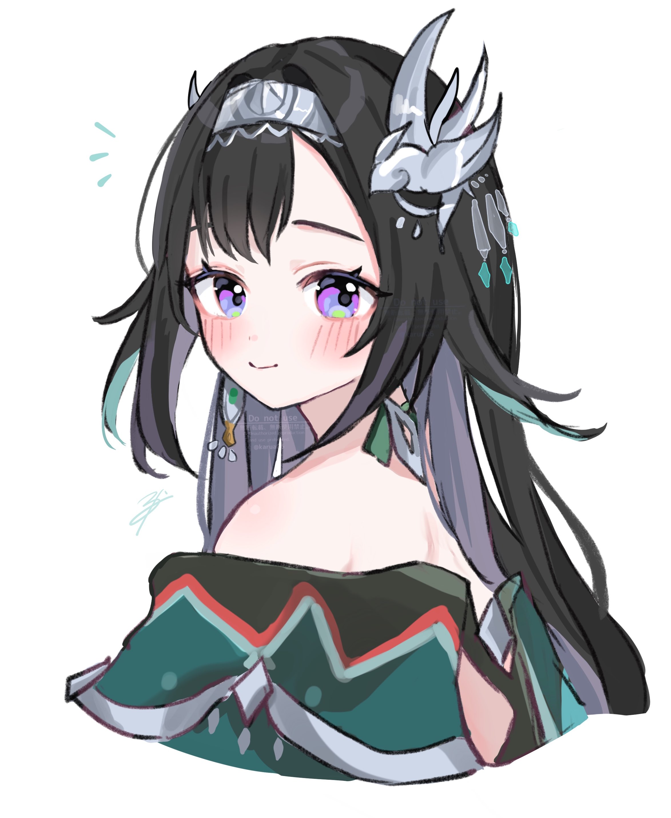 1girl absurdres bird_hair_ornament black_hair blush cropped_torso earrings genshin_impact green_hair grey_hair hair_ornament hairband highres jewelry karua0621 lan_yan_(genshin_impact) long_hair looking_at_viewer metal_hairband multicolored_hair purple_eyes signature simple_background single_earring solo upper_body white_background
