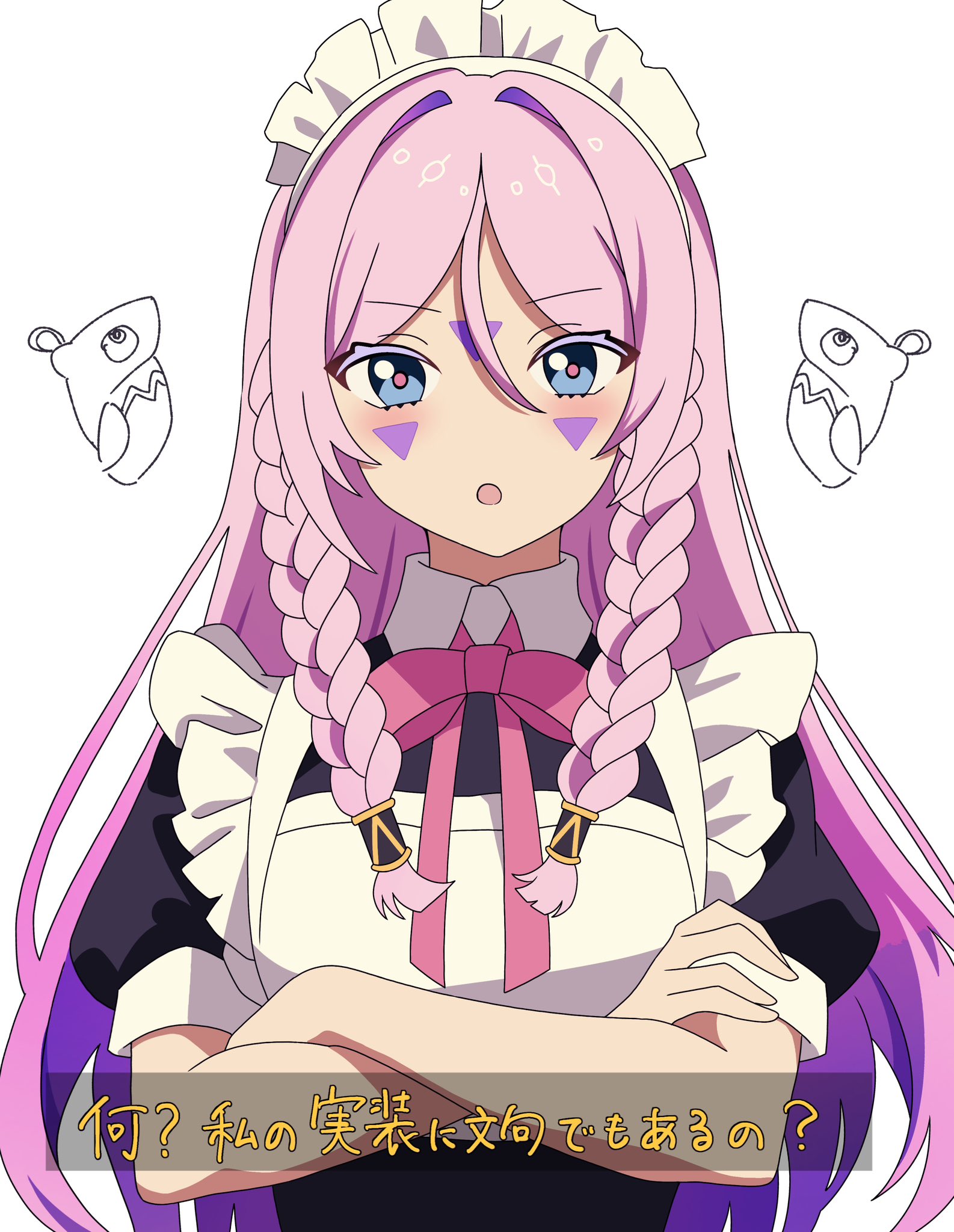 1girl :o alternate_costume apron blue_eyes blush braid citlali_(genshin_impact) commentary_request crossed_arms enmaided facial_mark forehead_mark frilled_apron frilled_hairband frills genshin_impact hair_between_eyes hairband highres long_hair looking_at_viewer maid maid_headdress multicolored_hair open_mouth pink_hair pink_pupils purple_hair short_sleeves solo translation_request very_long_hair white_apron white_background white_hairband woolly_(ll_0o0)