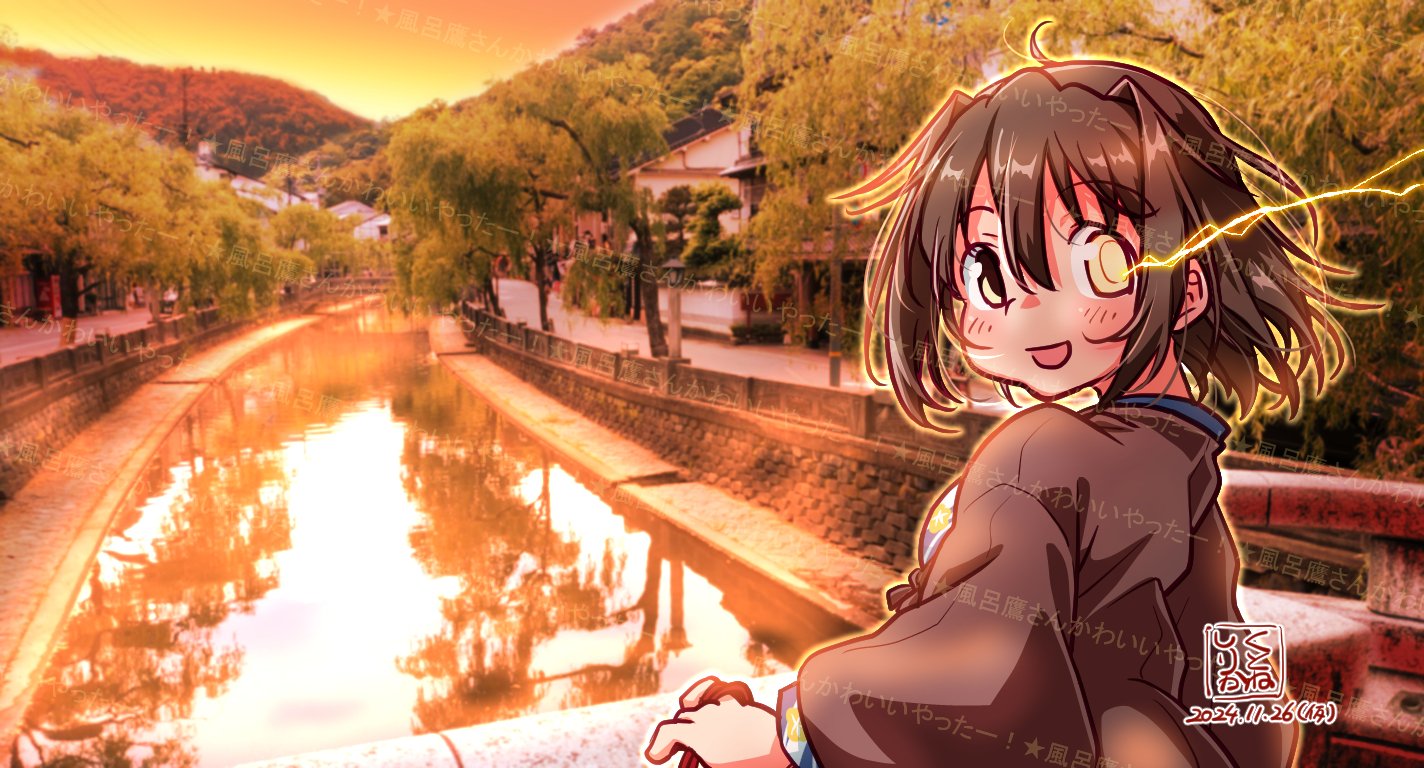 1girl artist_logo brown_hair brown_kimono dated from_behind furutaka_(kancolle) glowing glowing_eye heterochromia japanese_clothes kantai_collection kimono kutone_shirika logo looking_at_viewer looking_back river short_hair smile solo sunset upper_body watermark yellow_eyes