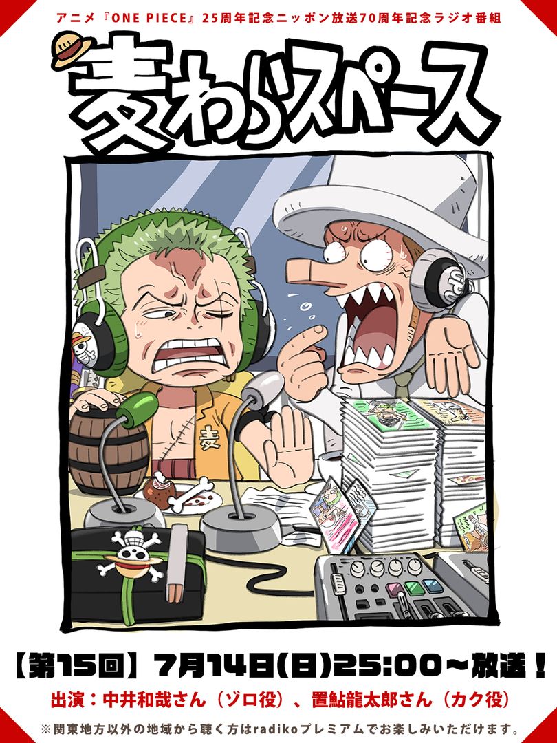 2boys bandana_around_arm blonde_hair commentary_request food green_hair grimace hat headphones kaku_(one_piece) letter long_nose matsuda_midori meat microphone multiple_boys official_art one_piece one_piece_straw_hat_space open_mouth pale_skin roronoa_zoro scar scar_across_eye scar_on_face sharp_teeth shirt short_hair sideburns stitched_torso stitches teeth v-shaped_eyebrows white_hat yellow_shirt