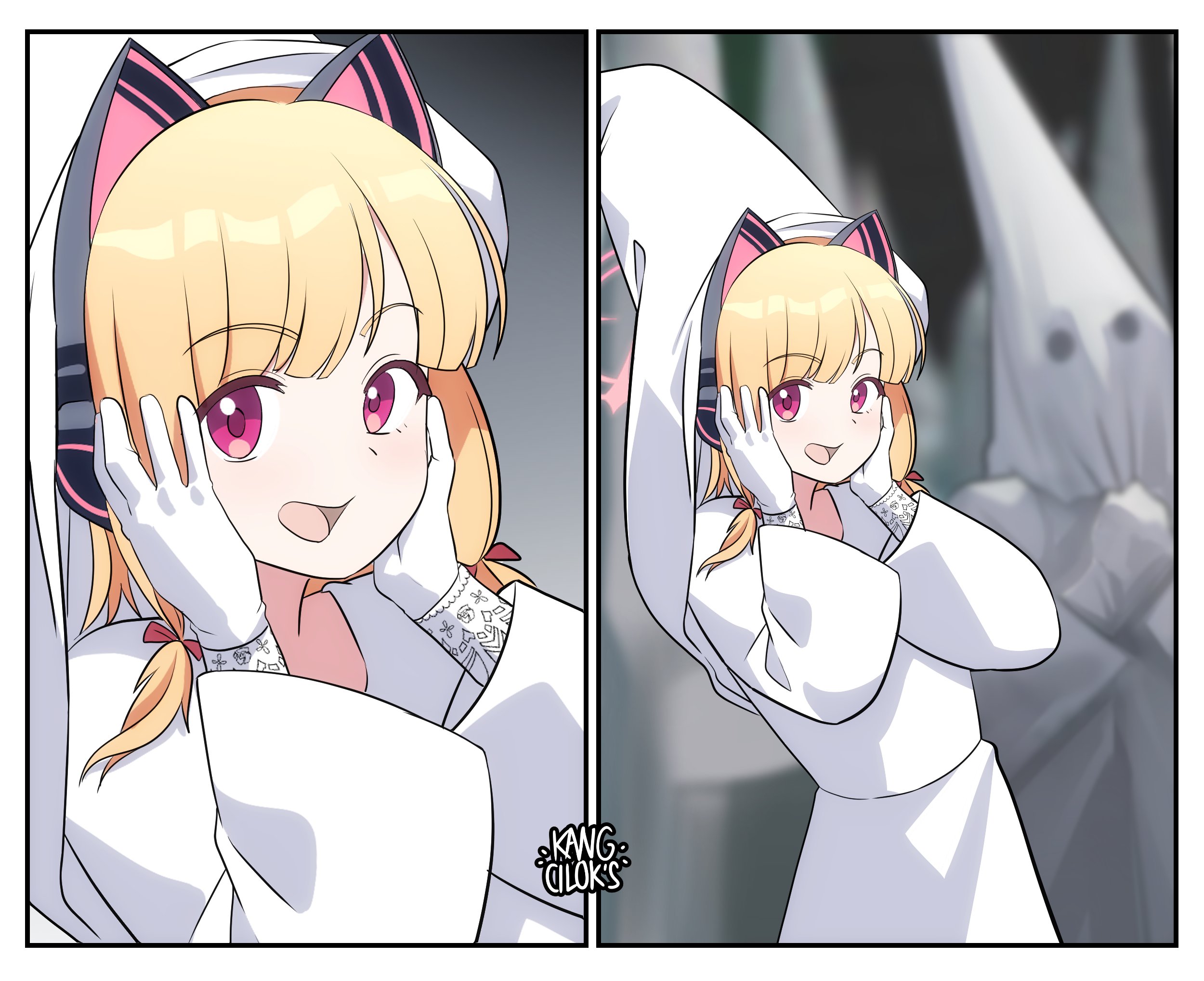 1girl 1other alternate_costume animal_ear_headphones animal_ears artist_name blonde_hair blue_archive blurry blurry_background border bow cat_ears commentary english_commentary fake_animal_ears gloves hair_bow halo hands_on_own_cheeks hands_on_own_face headphones highres kang_cilok's ku_klux_klan long_sleeves looking_at_viewer medium_hair meme momoi_(blue_archive) open_mouth pink_eyes pink_halo racist_momoi_(meme) red_bow robe short_twintails smile solo_focus twintails upper_body white_border white_gloves white_hood white_robe