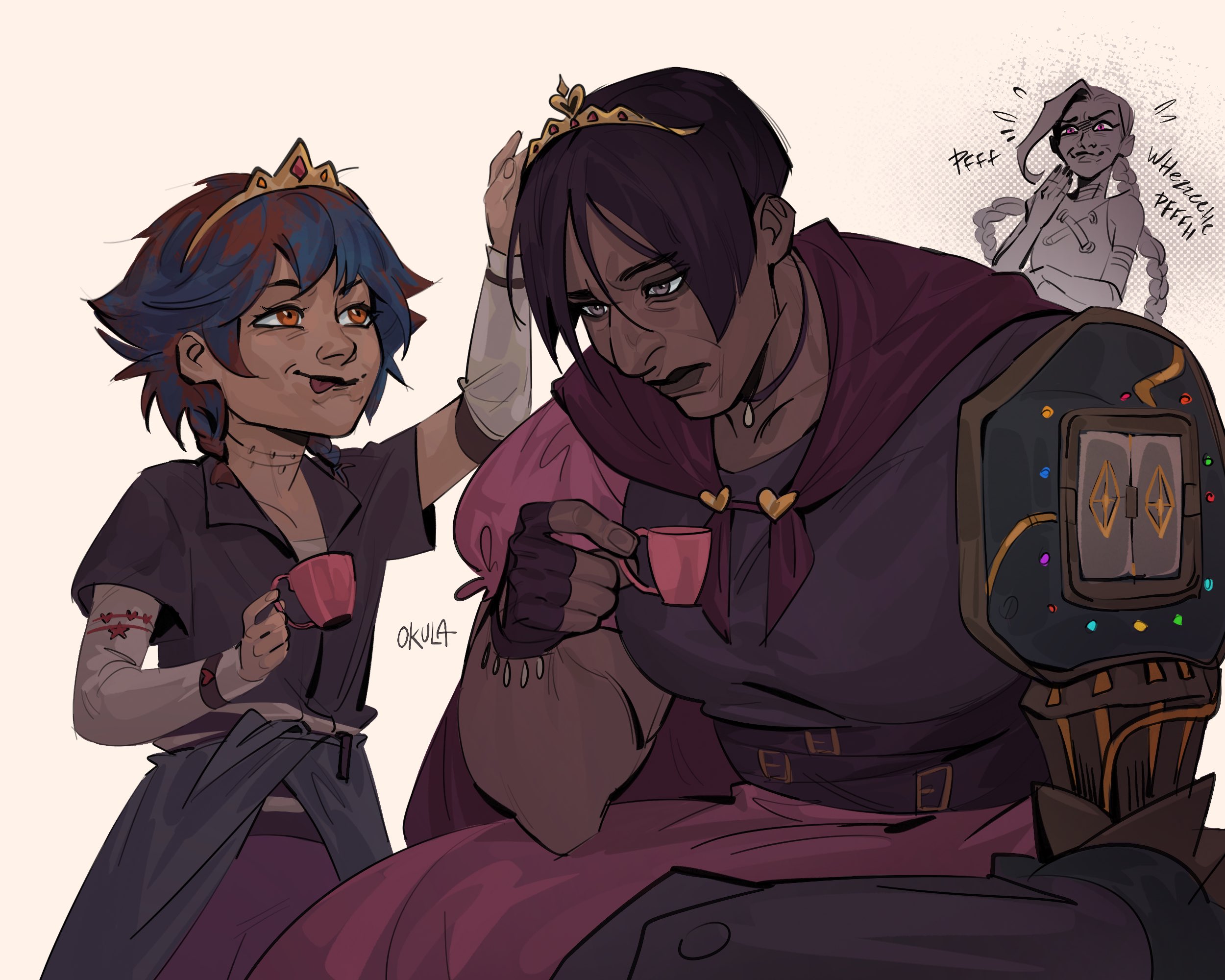 3girls :p arcane:_league_of_legends auntyokula blue_hair braid brown_hair child cup detached_sleeves highres holding holding_cup isha_(arcane) jinx_(league_of_legends) laughing league_of_legends mechanical_arms mole multiple_girls orange_eyes sevika_(arcane) single_mechanical_arm teacup tiara tongue tongue_out twin_braids