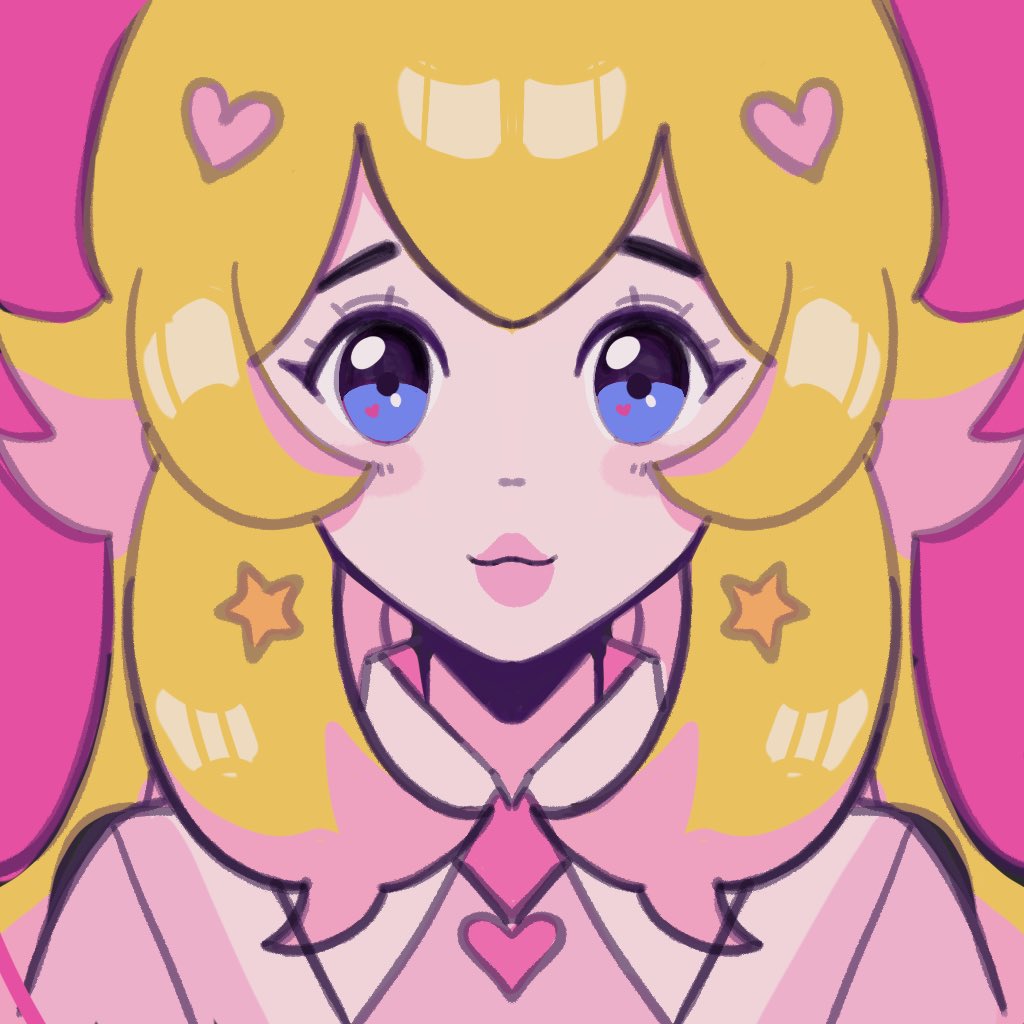1girl alternate_costume blonde_hair blue_eyes earrings happy jewelry long_hair looking_at_viewer mario_(series) meowwniz multicolored_hair nintendo open_mouth pink_background princess_peach shirt simple_background smile solo sticker sticker_on_hair streaked_hair