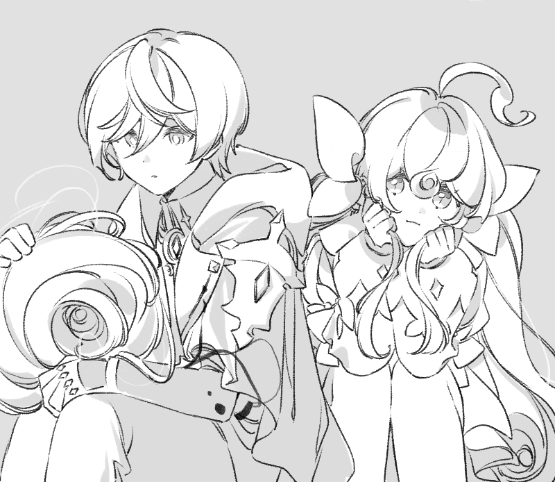 1boy 1girl :o ahoge bow closed_mouth commentary dress elsword english_commentary greyscale hair_bow hood hood_down hooded_jacket jacket jingle_(mhb729) laby_(elsword) liberator_(elsword) long_hair long_sleeves looking_at_another looking_down looking_to_the_side monochrome noah_ebalon official_alternate_costume open_clothes open_jacket radiant_soul_(elsword) short_hair sidelocks sitting twintails very_long_hair wavy_hair