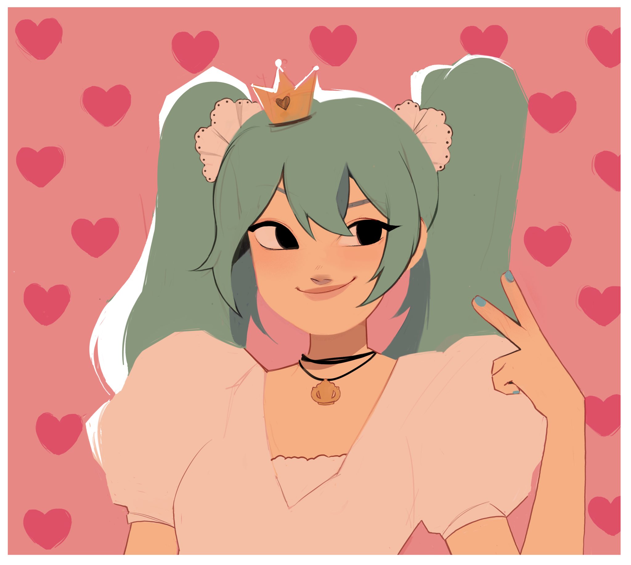 1girl aqua_eyes aqua_hair blue_eyes blue_hair crown dress hair_ribbon hatsune_miku heart heart_background highres jewelry long_hair looking_at_viewer milkoe nail_polish necklace ribbon skirt smile solo thighhighs twintails v very_long_hair world_is_mine_(vocaloid)