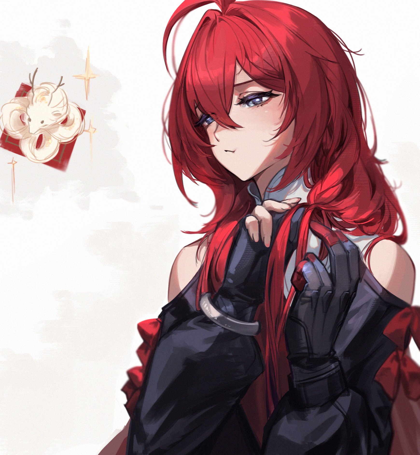 1girl ahoge bare_shoulders black_gloves blue_eyes closed_mouth clothing_cutout commentary danjin_(wuthering_waves) english_commentary fingerless_gloves gloves hair_down hair_intakes half-closed_eyes hands_in_own_hair highres long_hair red_hair shoulder_cutout simple_background single_fingerless_glove solo steve_zheng upper_body white_background wuthering_waves