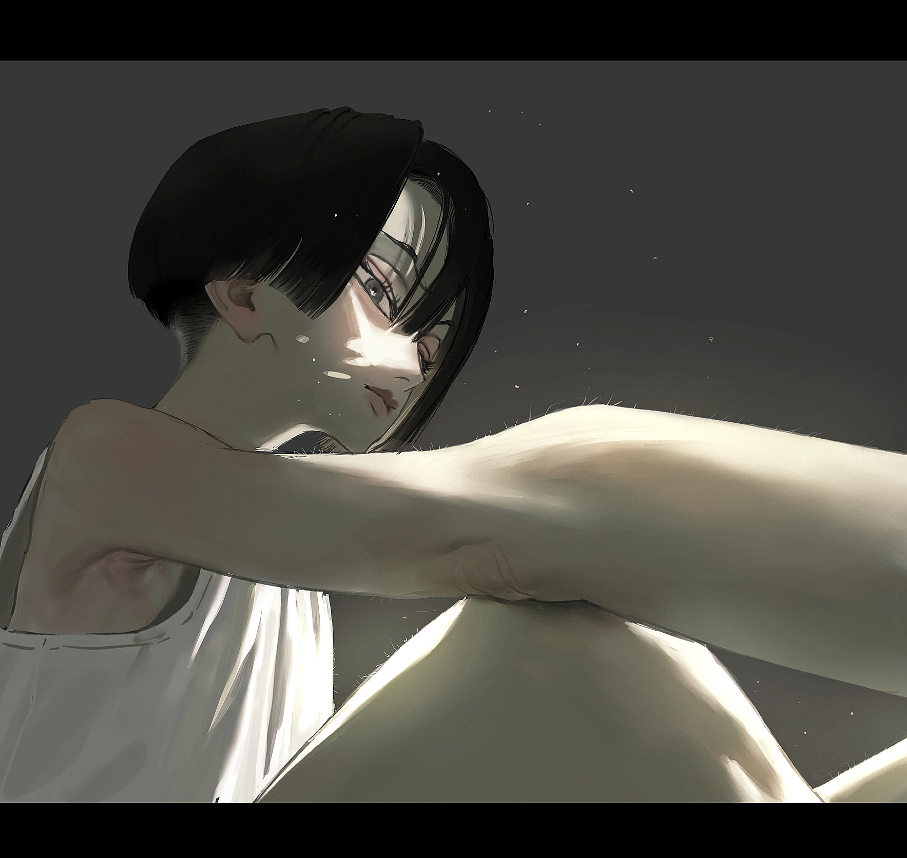 1girl black_hair closed_mouth commentary_request grey_background grey_eyes highres knees_up letterboxed original short_hair simple_background sitting skinny solo sunlight tank_top undercut unko_man white_tank_top