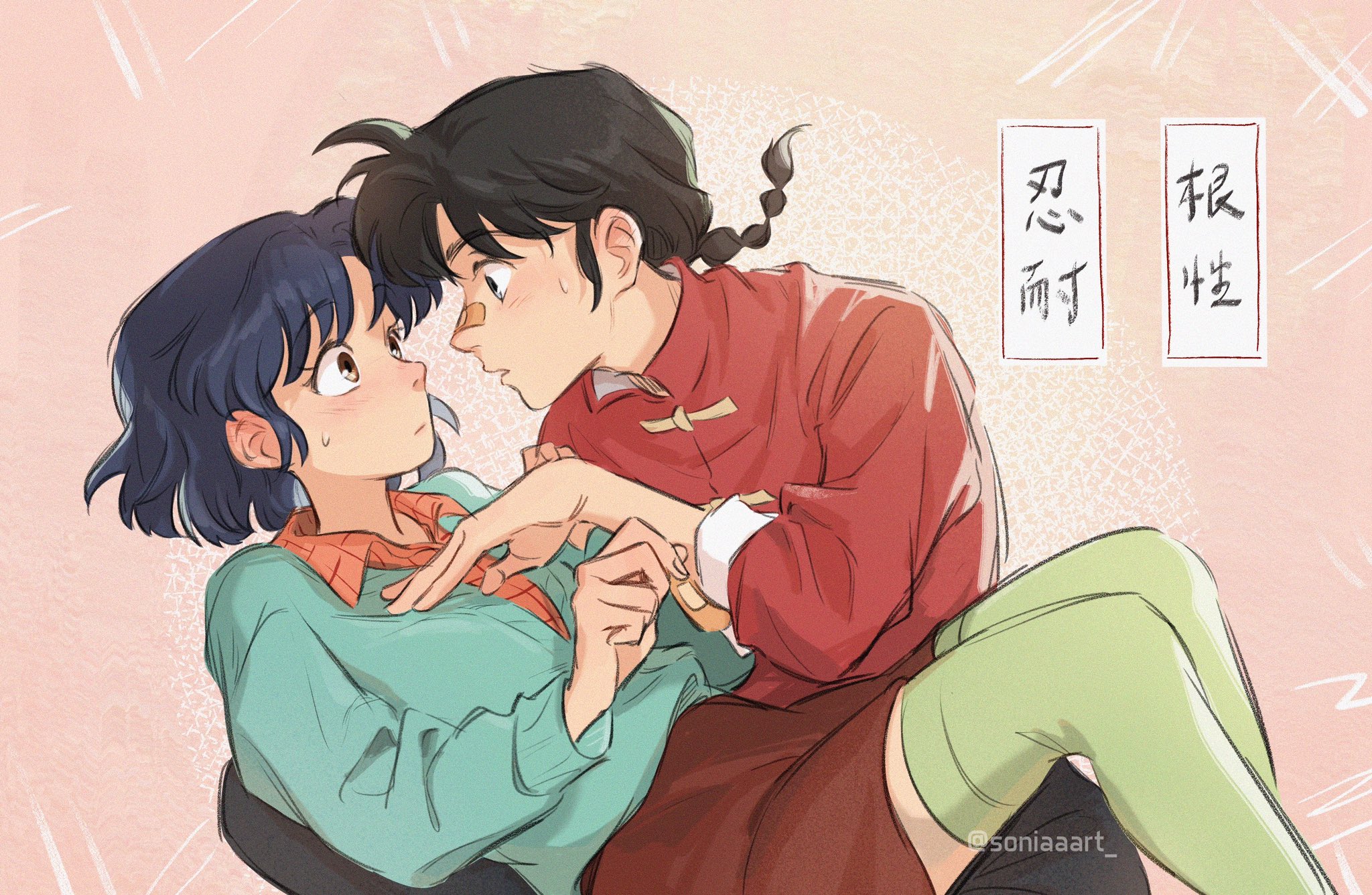 1boy 1girl black_hair blush braid braided_ponytail brown_skirt closed_mouth highres looking_at_another ranma_1/2 saotome_ranma skirt soniaaart tendou_akane