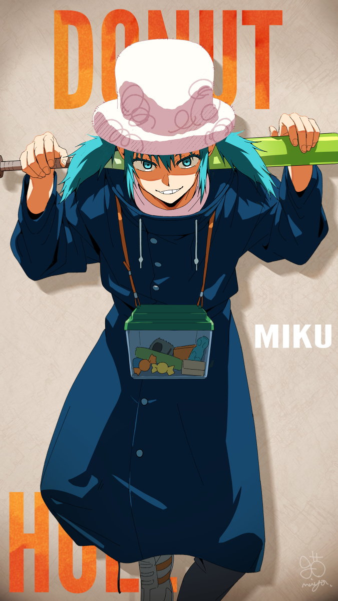 1girl aqua_eyes aqua_hair baseball_bat blue_coat buttons candy character_name coat container donut_hole_(vocaloid) food hat hatsune_miku highres holding holding_baseball_bat looking_at_viewer neko_miya shaded_face short_twintails sidelocks signature smile solo song_name top_hat twintails vocaloid white_hat
