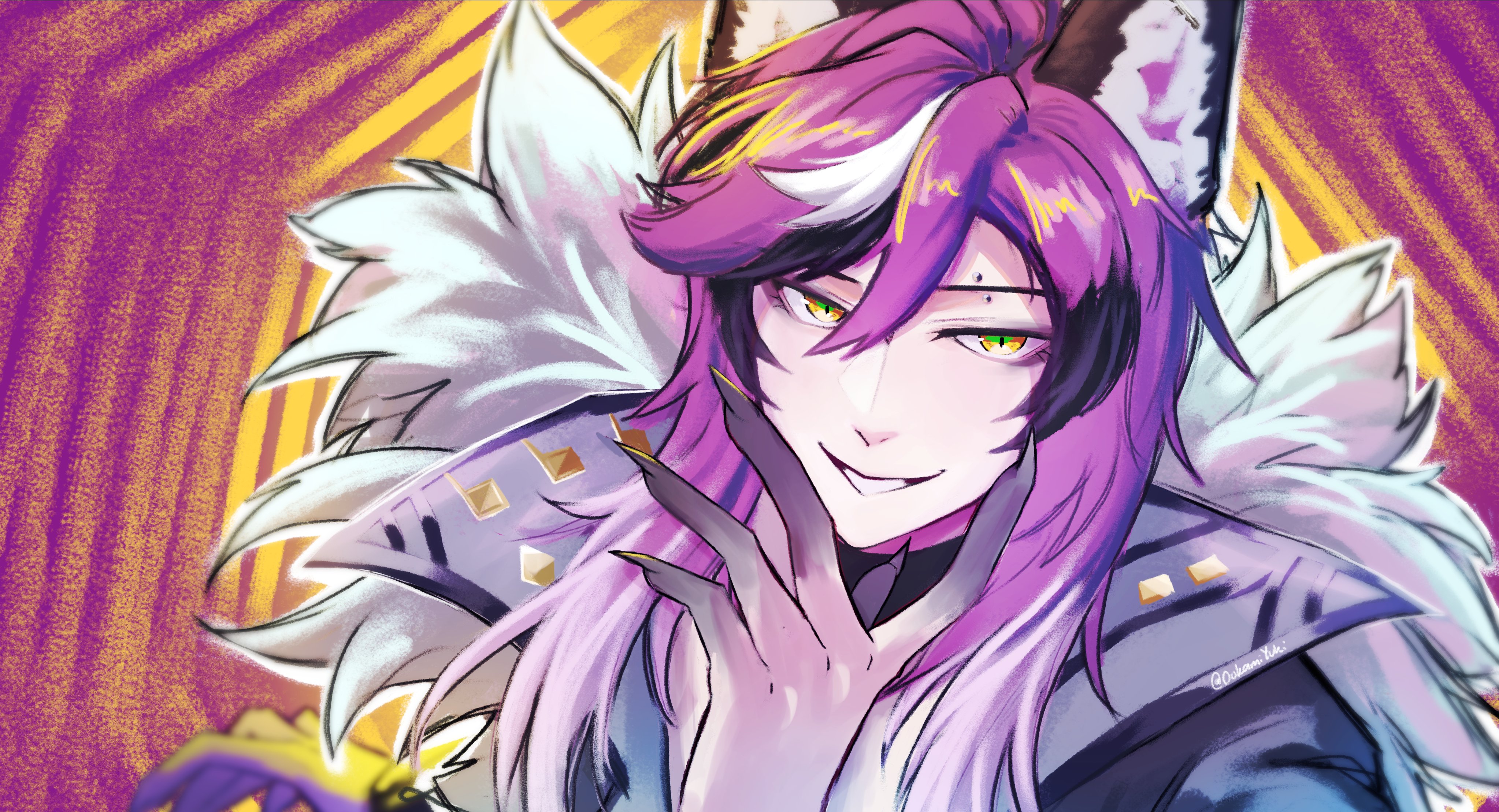 0okamiyuki 1boy absurdres animal_ear_fluff animal_ears arm_up black_coat black_hair claws coat collared_coat commentary doppio_dropscythe doppio_dropscythe_(2nd_costume) eyebrow_piercing face_piercing fur_trim grin hair_between_eyes hand_on_own_face highres kemonomimi_mode long_hair looking_at_viewer male_focus multicolored_eyes multicolored_hair nijisanji nijisanji_en piercing purple_hair slit_pupils smile solo teeth twitter_username upper_body virtual_youtuber white_fur white_hair