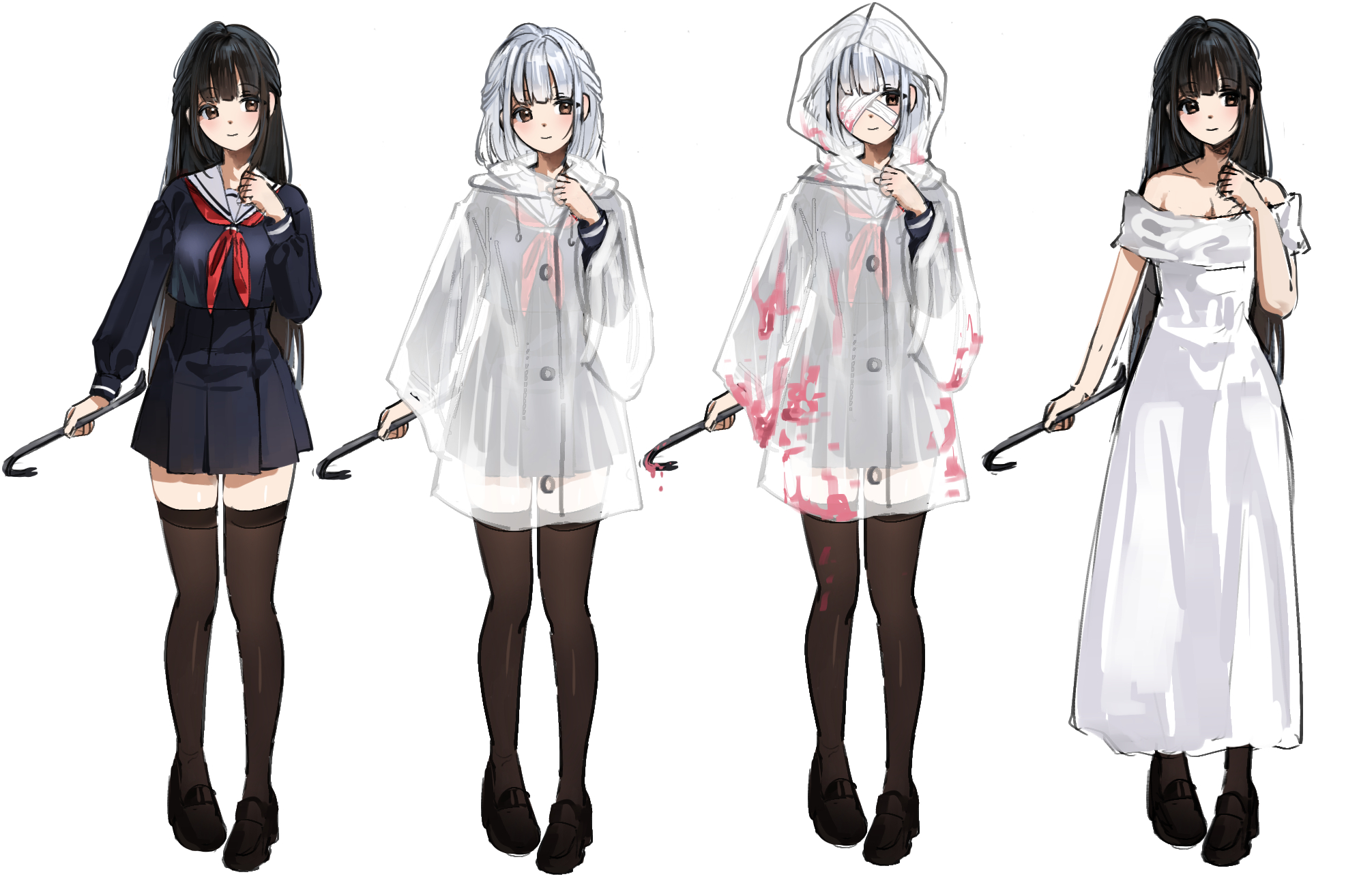 1girl ae030 black_footwear black_hair blue_serafuku blue_shirt blue_skirt brown_eyes brown_hair brown_thighhighs closed_mouth commentary crowbar dress adashino_adami highres holding holding_crowbar homicipher hood hood_up loafers long_hair looking_to_the_side medium_hair multiple_views neckerchief off-shoulder_dress off_shoulder pleated_skirt raincoat red_neckerchief sailor_collar school_uniform serafuku shirt shoes skirt smile thighhighs very_long_hair white_dress white_hair white_raincoat white_sailor_collar