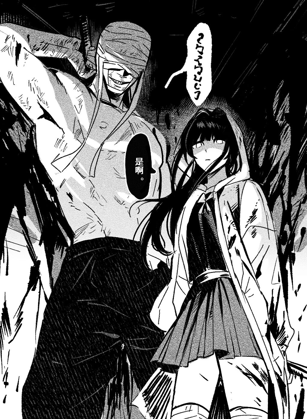 1boy 1girl 949805342 arm_up bandages bandages_over_eyes blood crowbar greyscale adashino_adami highres holding holding_crowbar homicipher homicipher_text long_hair long_sleeves looking_at_viewer monochrome mr._machete muscular muscular_male parted_lips raincoat school_uniform serafuku sidelocks speech_bubble translation_request very_long_hair