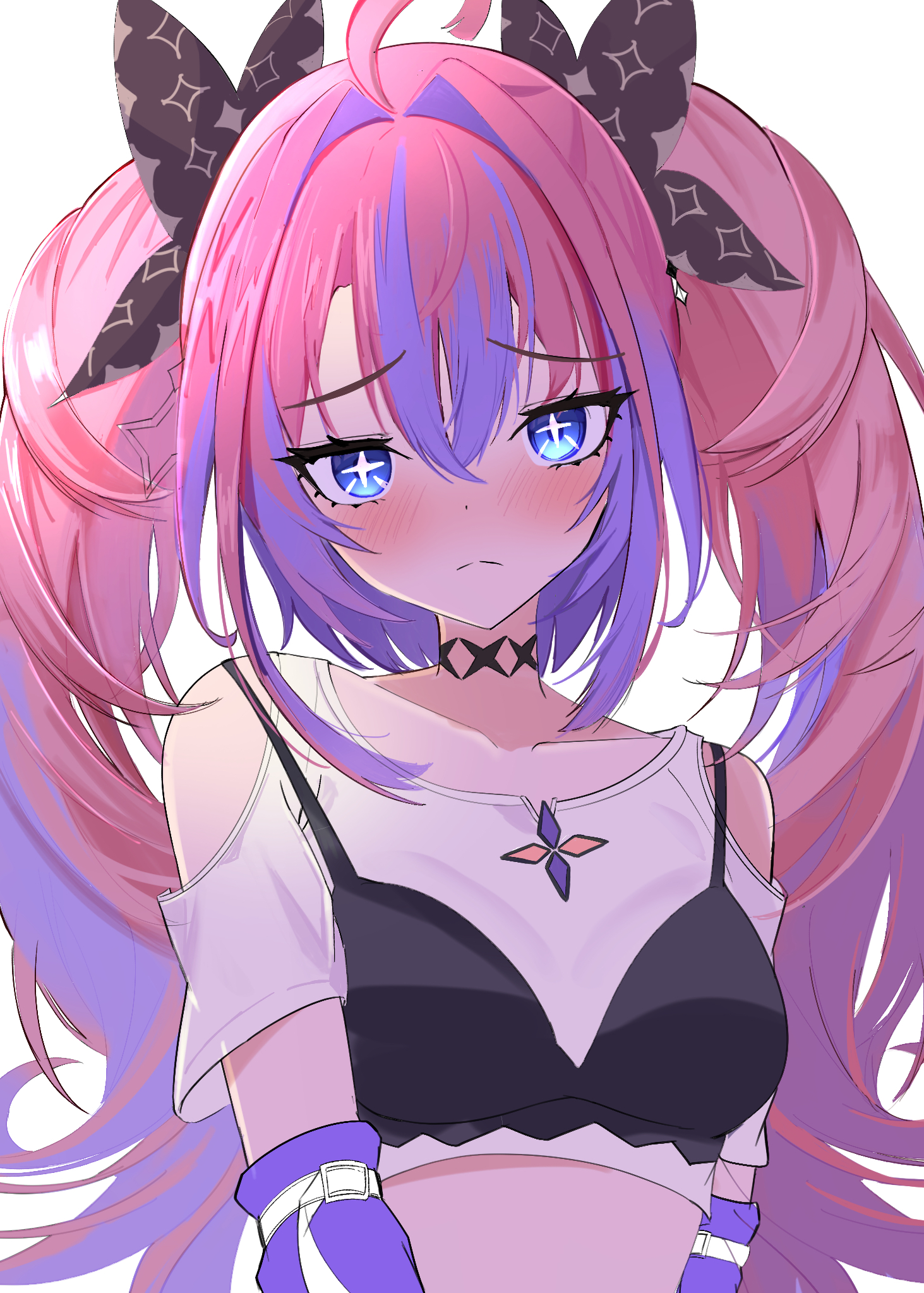 1girl ahoge arm_warmers black_bow blue_eyes blush bow bra_over_clothes cropped_shirt hair_bow highres hololive hololive_dev_is kikirara_vivi long_hair looking_at_viewer multicolored_hair pink_hair purple_arm_warmers purple_hair shirt solo streaked_hair twintails umikotatsu very_long_hair virtual_youtuber white_shirt