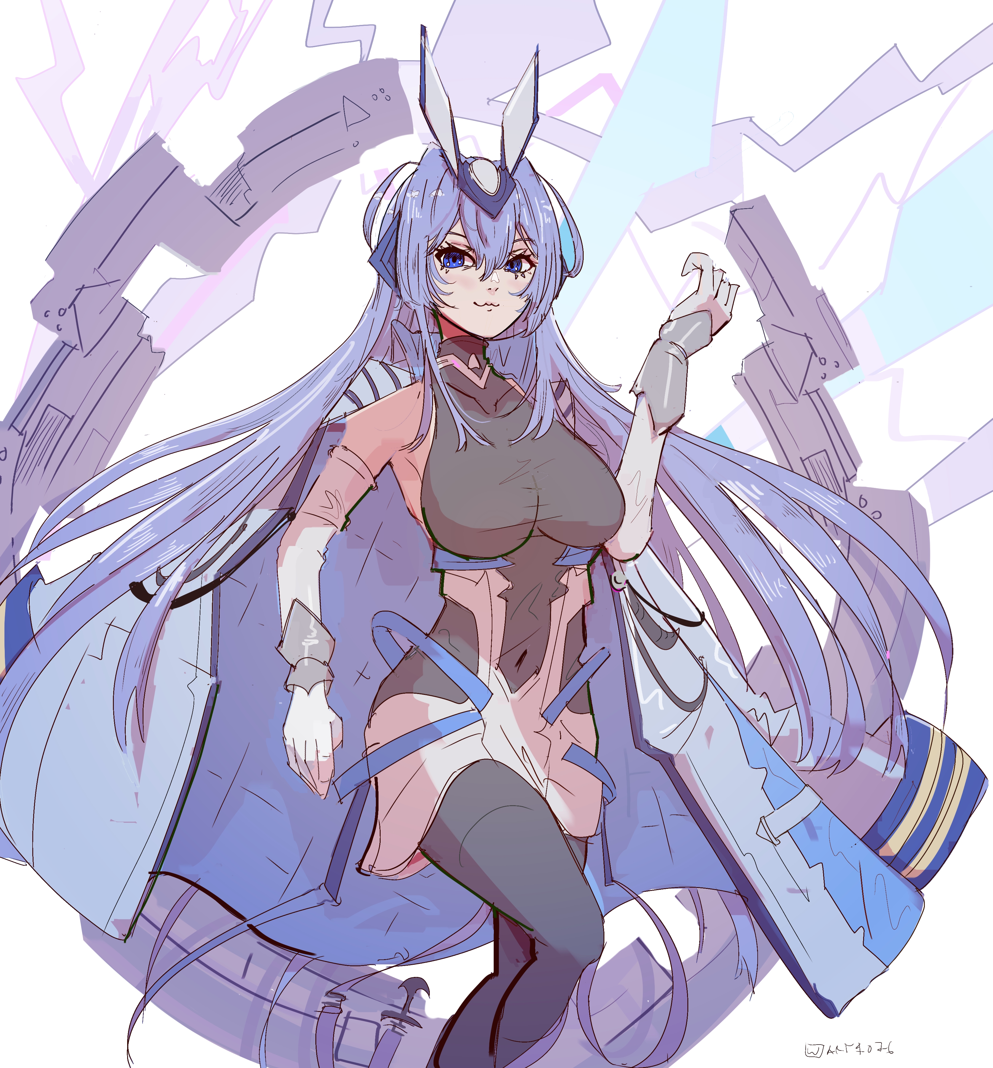 1girl :3 absurdres anchor armpits artist_name azur_lane bare_shoulders blue_eyes blue_hair bodysuit breasts cleavage coat coat_on_shoulders gloves hair_between_eyes headgear highres large_breasts long_coat long_hair looking_at_viewer navel new_jersey_(azur_lane) rigging see-through_cleavage see-through_clothes sidelocks simple_background skirt smile solo solo_focus very_long_hair wart1076 white_coat white_gloves