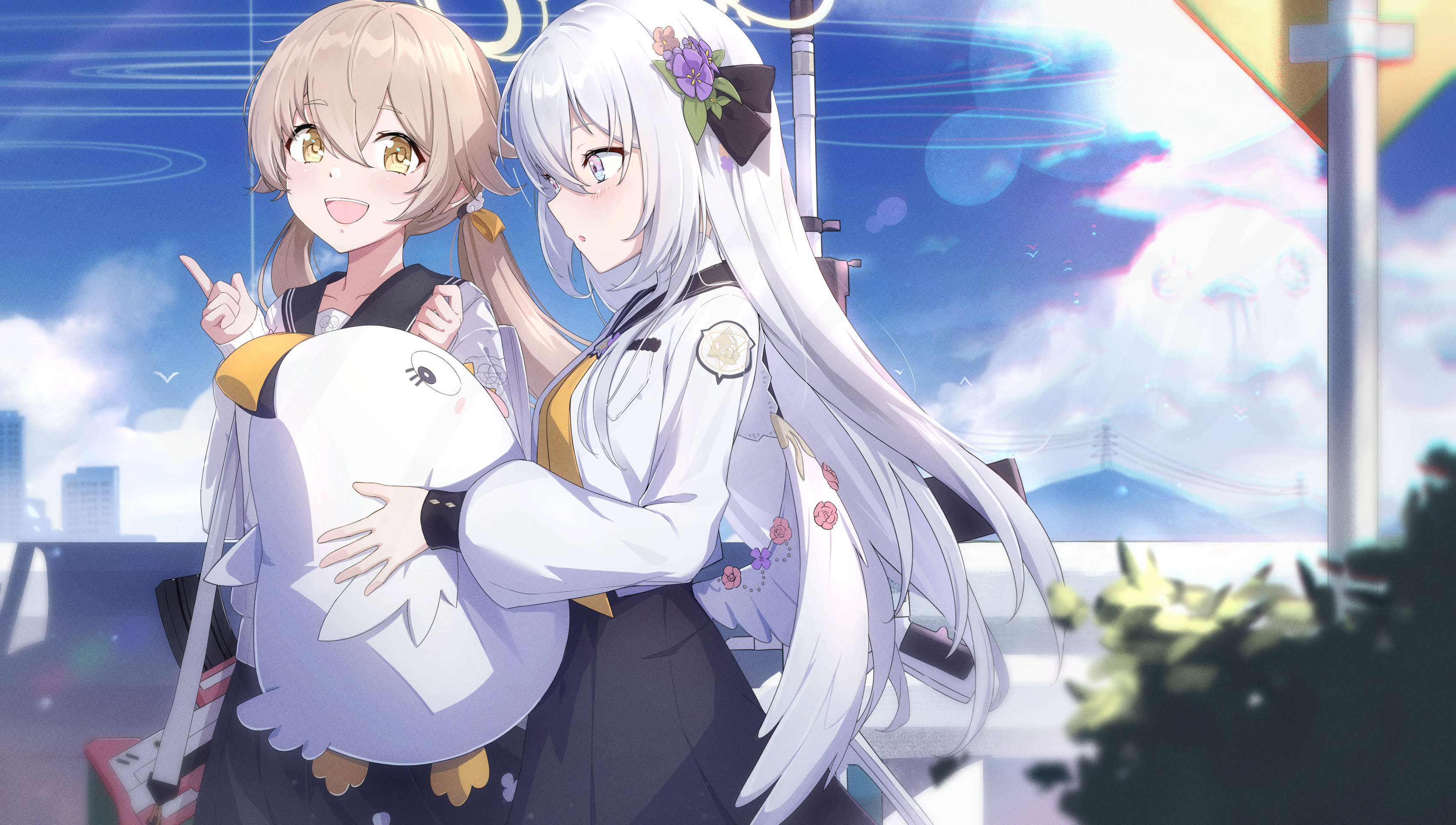 2girls absurdres azusa_(blue_archive) black_dress blue_archive brown_eyes dress grey_hair gun halo hifumi_(blue_archive) highres jacket light_brown_hair long_hair low_twintails multiple_girls peroro_(blue_archive) purple_eyes sign stuffed_toy tokisaka_makoto twintails weapon white_jacket wing_ornament wings yellow_halo