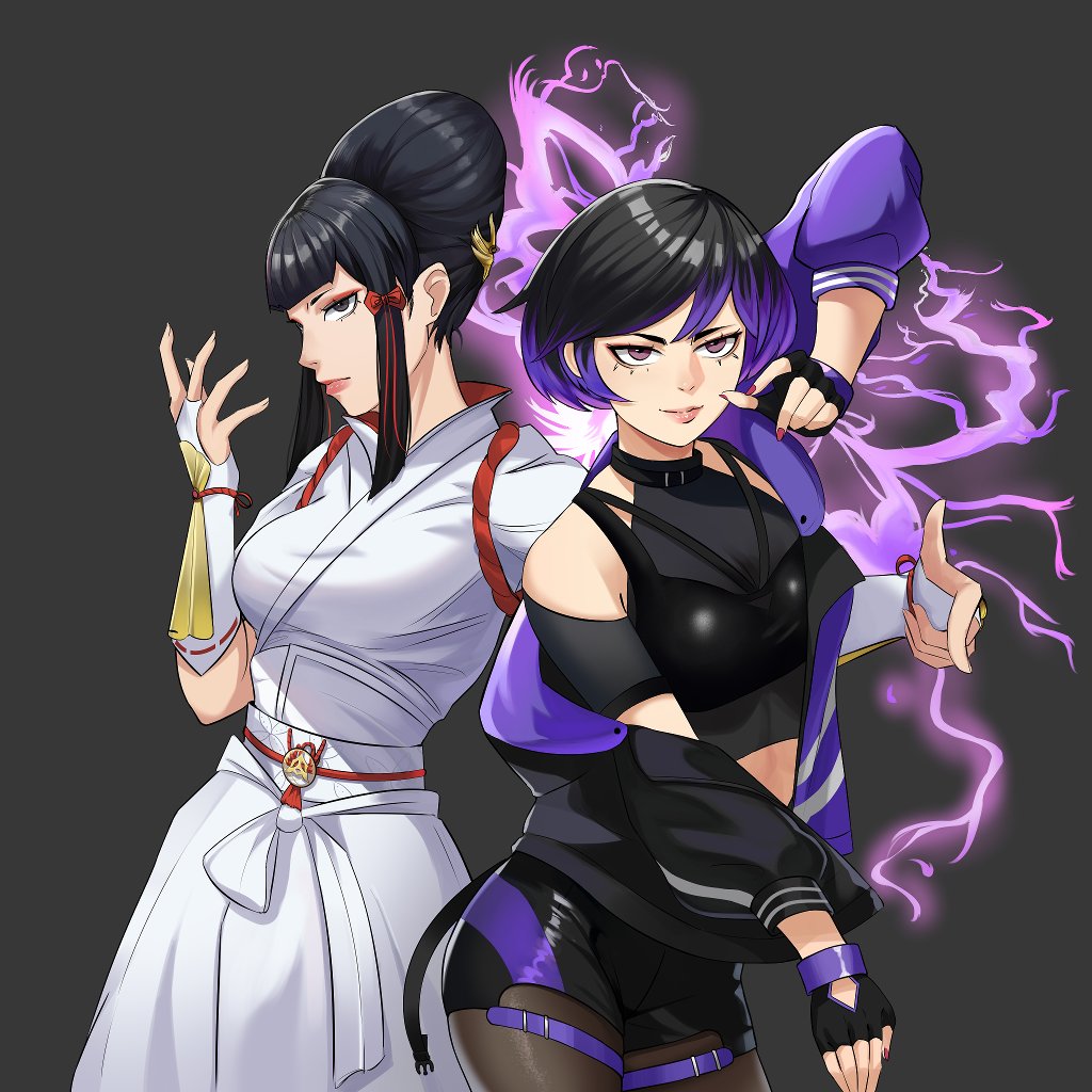 2girls black_and_purple_hair black_hair brown_eyes jetblaackk lightning mishima_kazumi_(tekken) mother_and_child mother_and_daughter multiple_girls namco parent_and_child purple_eyes reina_(tekken) tekken