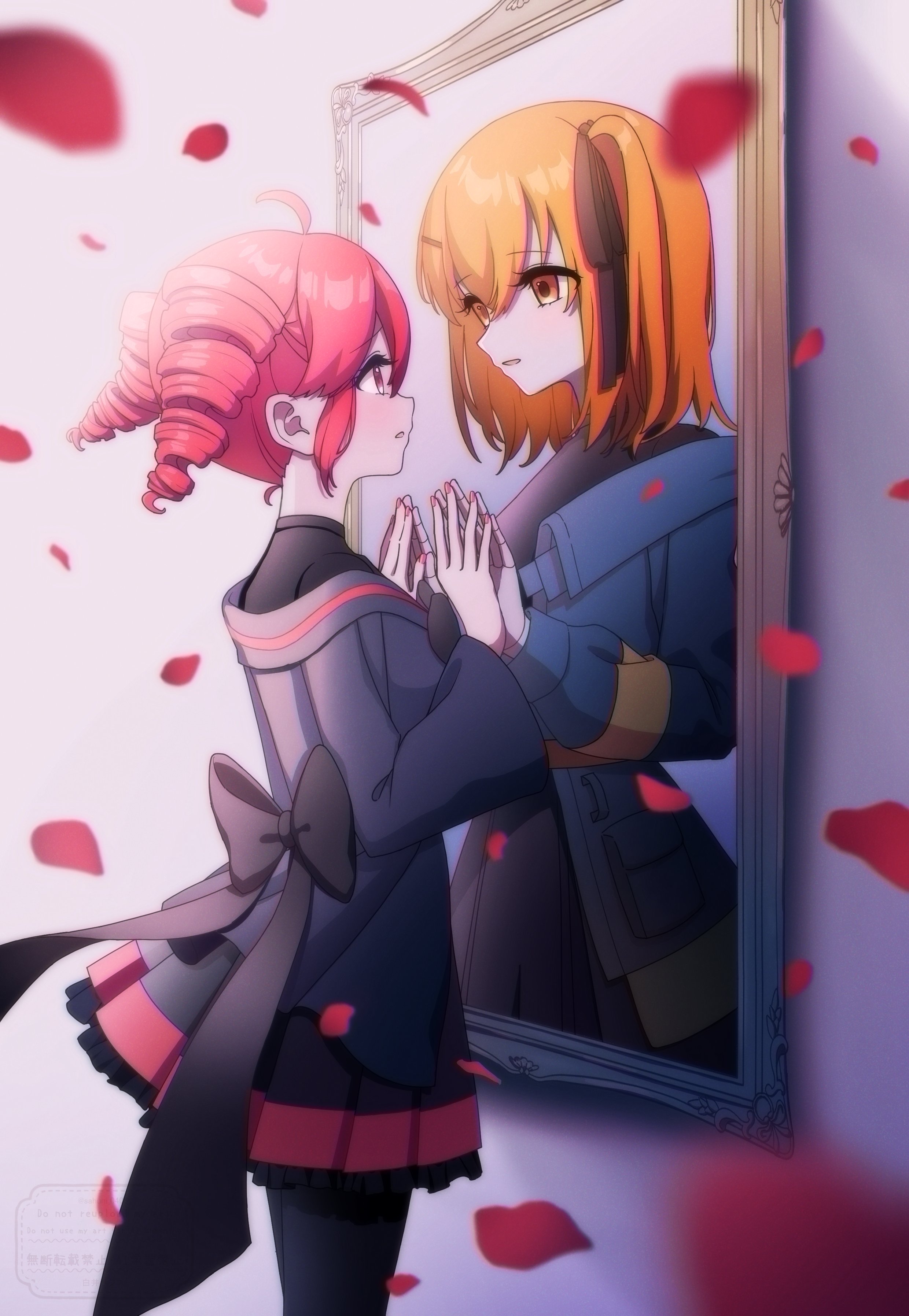 2girls a.i._voice absurdres adachi_rei ahoge back_bow black_bow black_coat black_dress black_pantyhose black_ribbon black_shirt bow coat cowboy_shot dress drill_hair falling_petals grey_background hair_between_eyes hair_ribbon highres kasane_teto looking_at_another mu_(utau) multiple_girls open_mouth orange_eyes orange_hair pantyhose petals picture_frame pleated_skirt red_eyes red_hair red_trim ribbon shirai_sahuni shirt simple_background skirt standing twin_drills utau