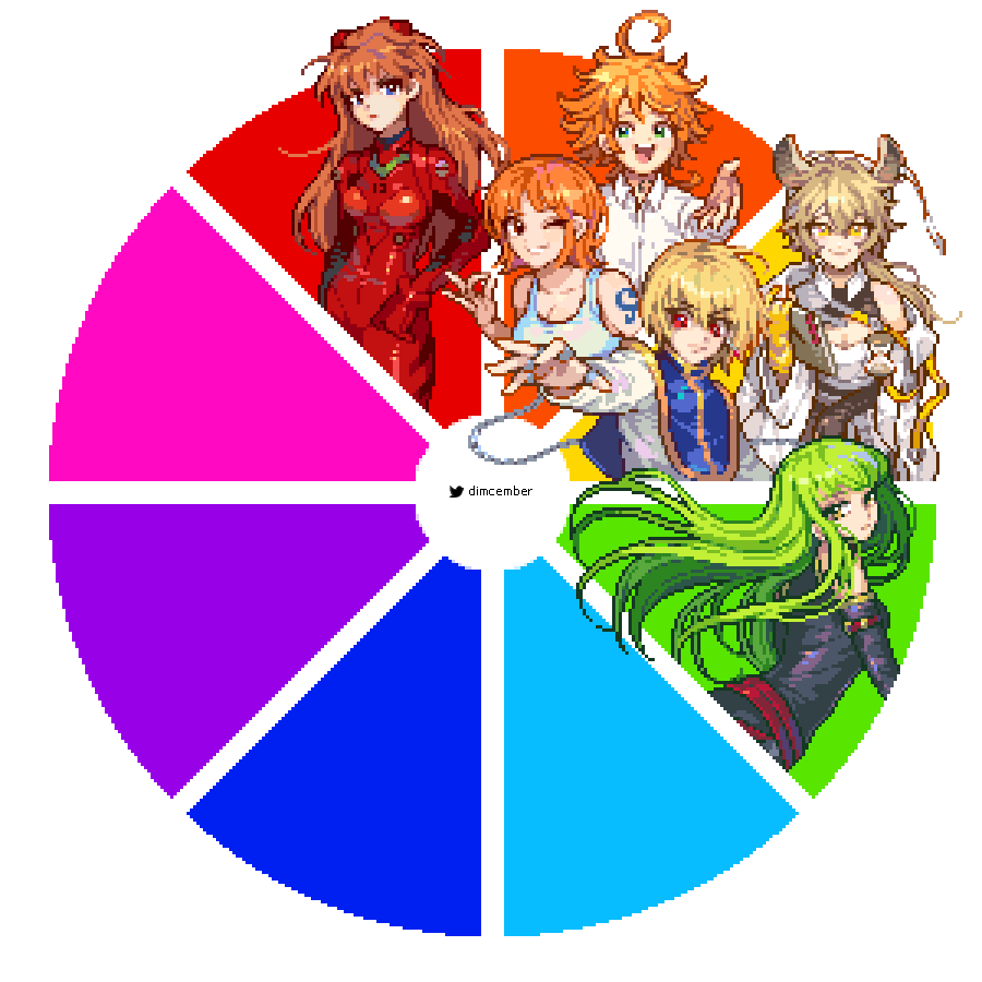1boy 5girls animal_ears arknights artist_name blonde_hair blue_eyes bodysuit breasts brown_hair c.c. chain cleavage code_geass collared_shirt color_wheel_challenge commentary dimcember dorothy_(arknights) emma_(yakusoku_no_neverland) english_commentary floating_hair gloves green_eyes green_hair hunter_x_hunter kurapika long_hair long_sleeves mecha_pilot_suit multiple_drawing_challenge multiple_girls nami_(one_piece) neon_genesis_evangelion one_piece orange_hair pixel_art plugsuit_(evangelion) red_bodysuit red_eyes round_border shirt short_hair souryuu_asuka_langley tank_top tattoo twitter_logo unfinished white_shirt white_tank_top yakusoku_no_neverland yellow_eyes yellow_gloves